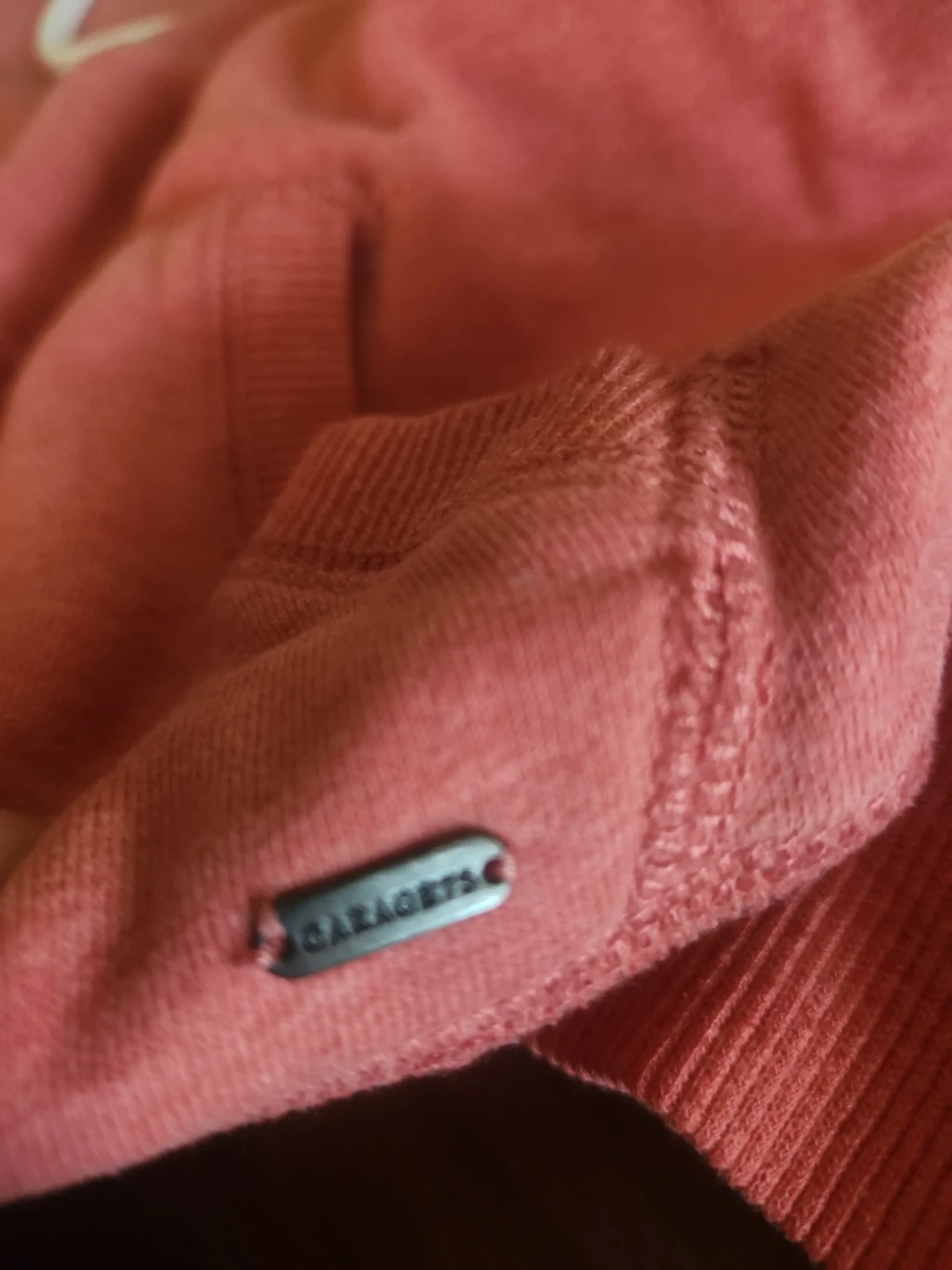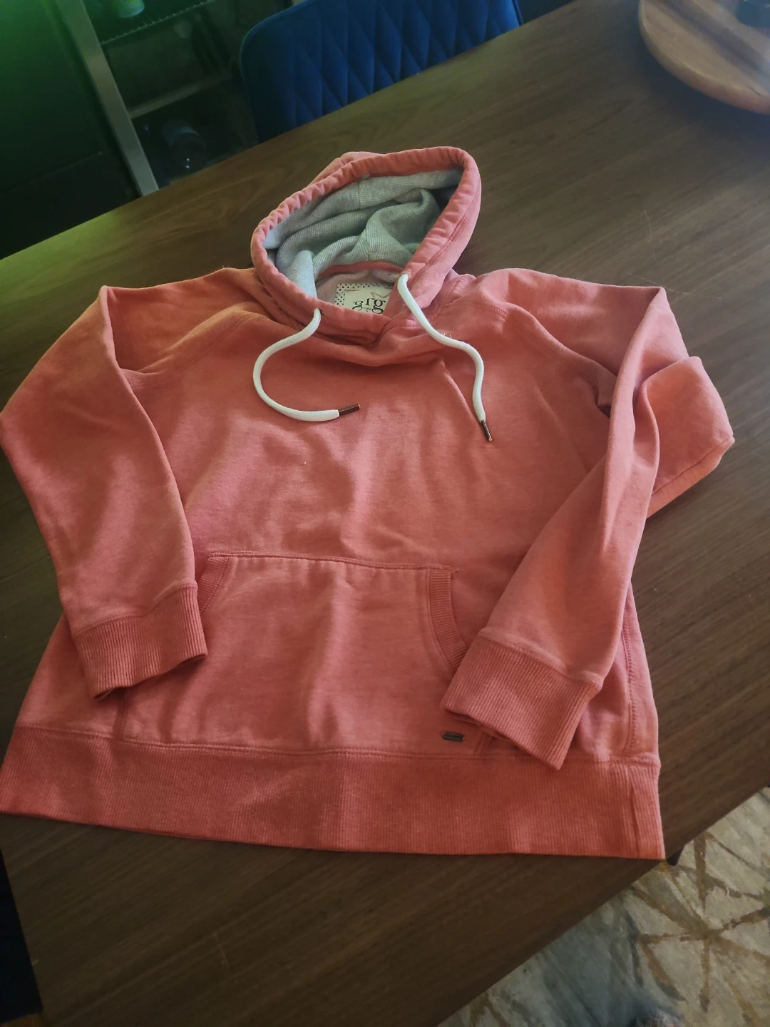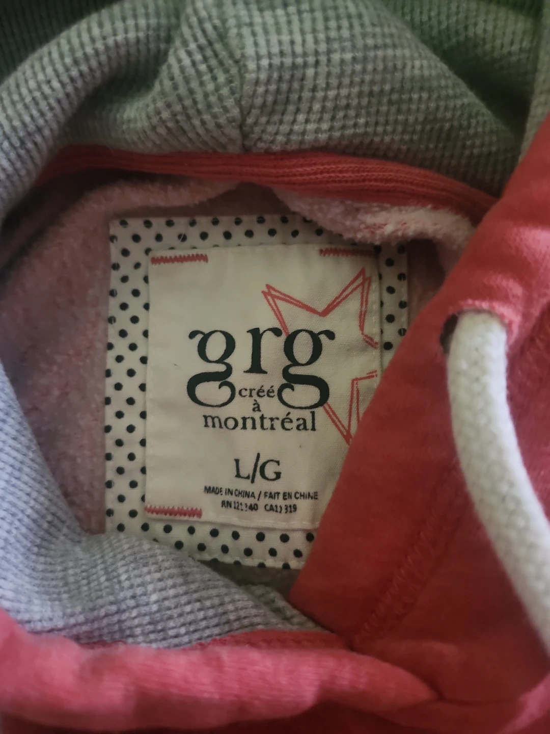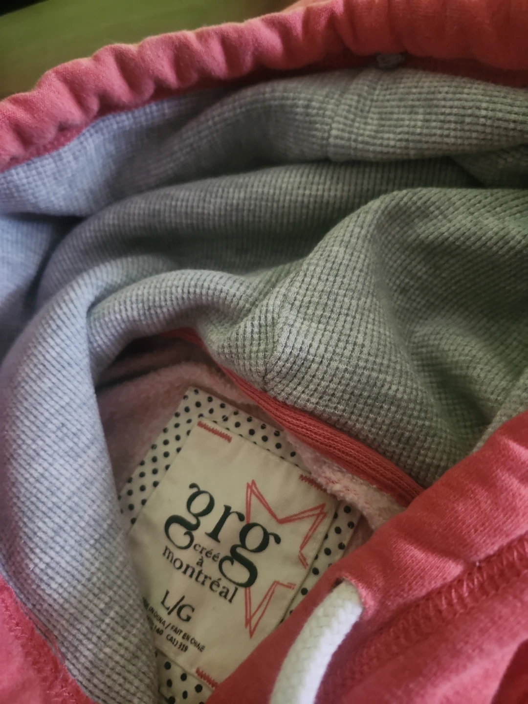 GRG Montréal hooded sweatshirt in a heathered pink colour. Size L/G. Quality pulls strings with metal ends. Front pouch for your phone or whatever. Not a bulky sweatshirt