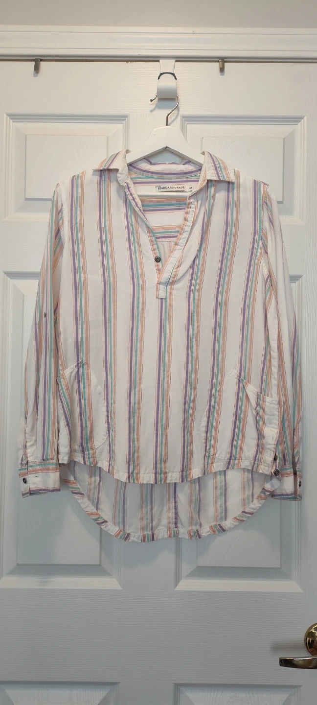 A Standard Grace collared pullover shirt with a pastel stripe pattern. It's with a relaxed fit and front pockets. This shirt is made of a lightweight fabric, perfect for casual wear.