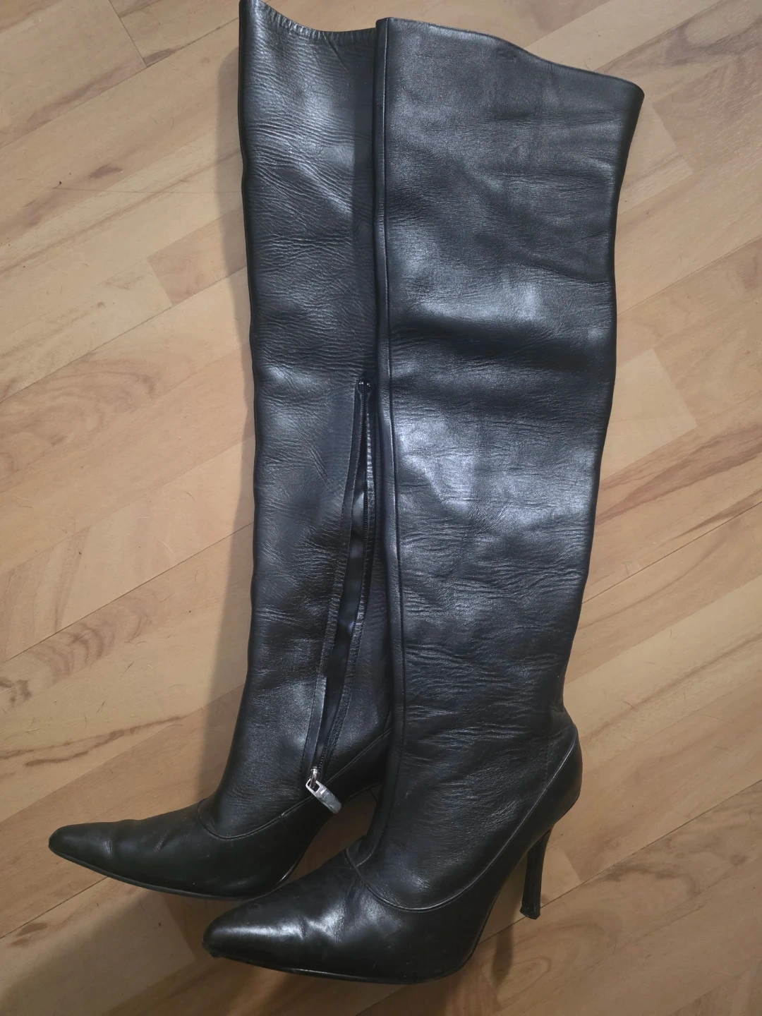Black leather over-the-knee boots with side zippers and a stiletto heel. These boots are made from genuine leather with a pointed toe. They're perfect for dressing up any outfit!