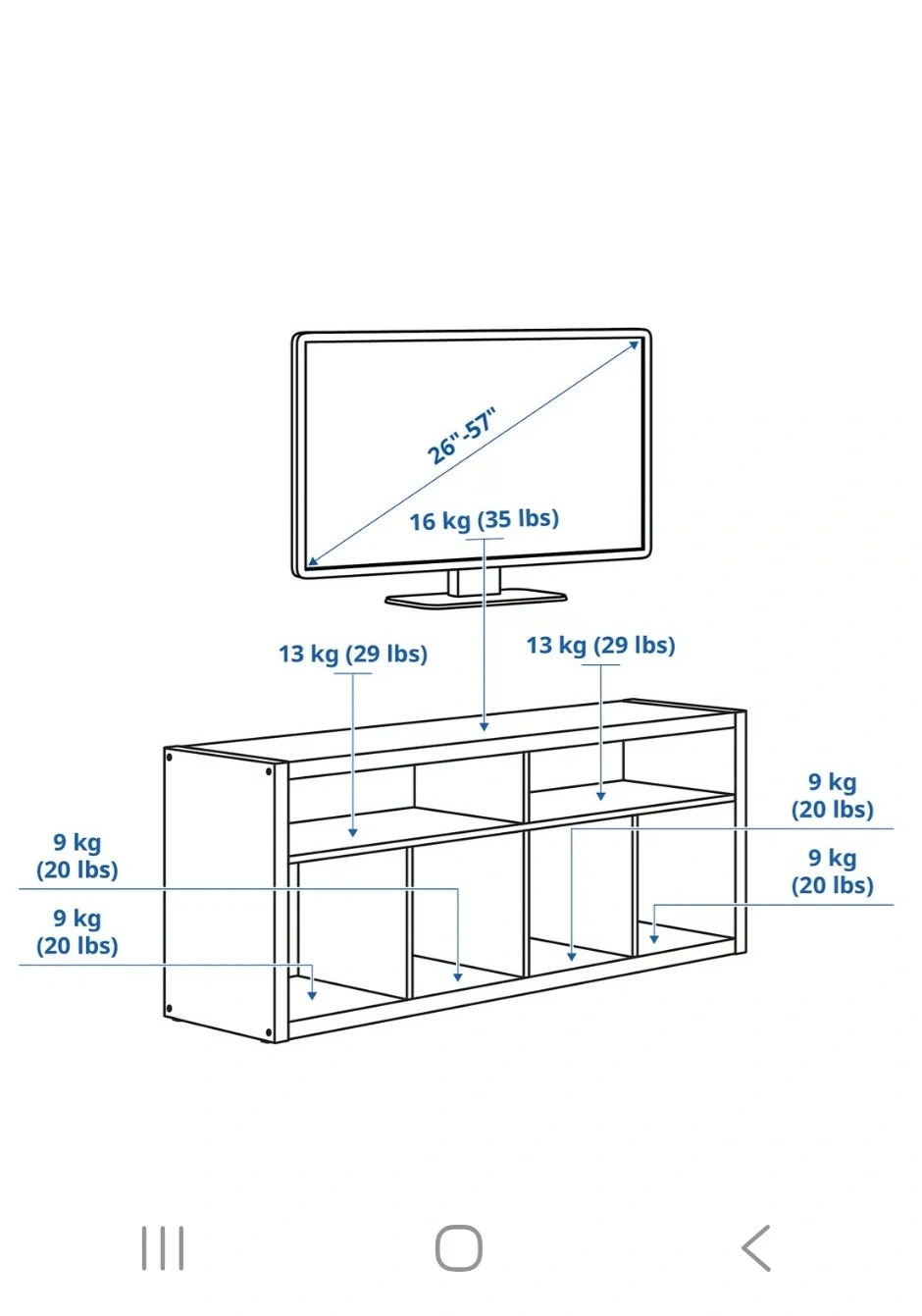 This TV bench / media stand is designed to hold your electronics and perhaps a vinyl collection. It features two main shelves for media components and lower shelving for records. The wood and white metal construction offers a modern look. Measurements and details are in pictures 3 and 4.