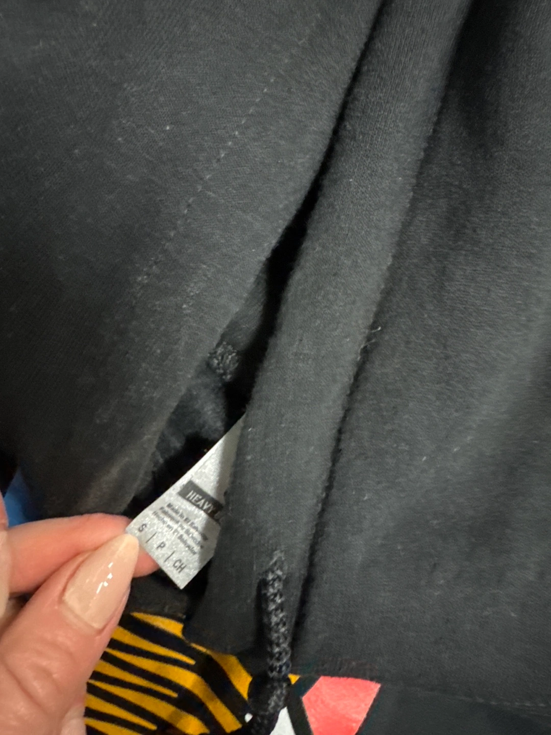 Bundle of two black hoodies. One pullover hoodie features a sneaker graphic. The other is a zip-up hoodie with a Spotify for Creative logo. Both appear to be in good condition.