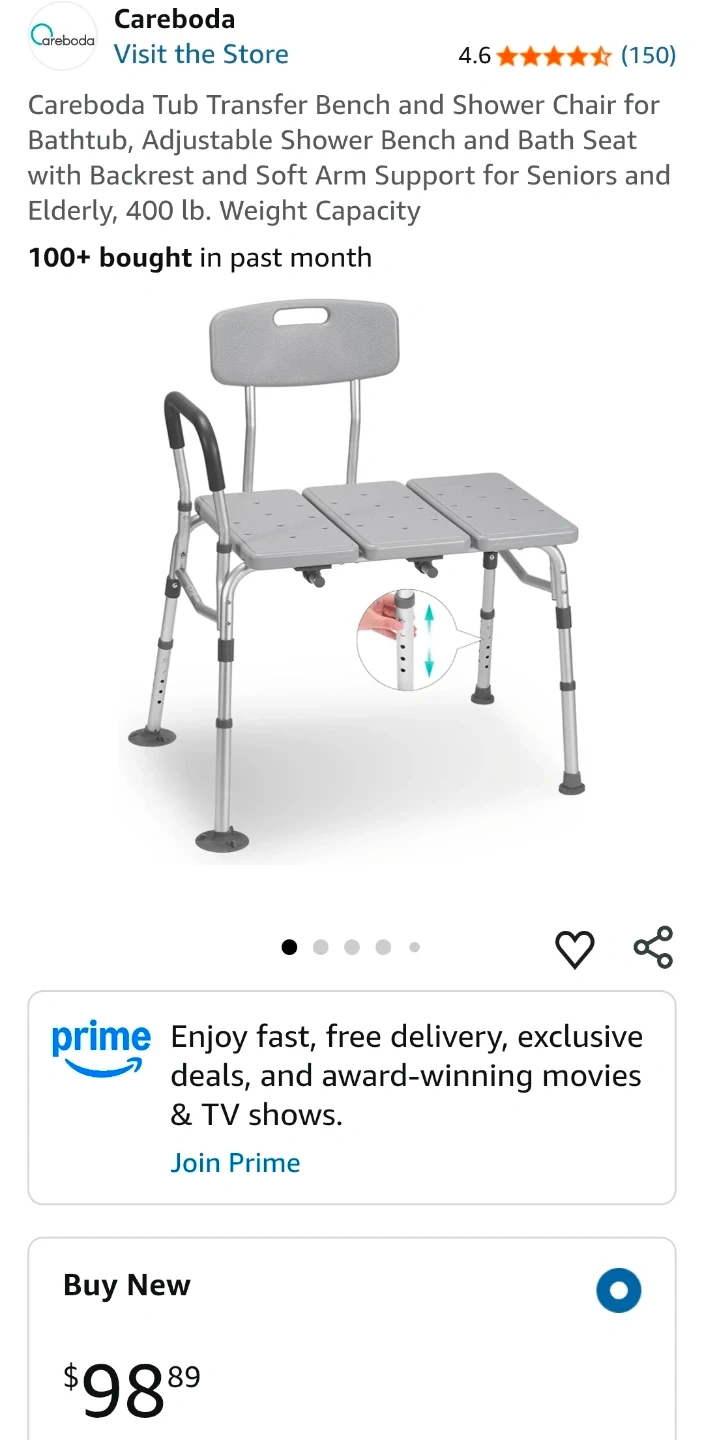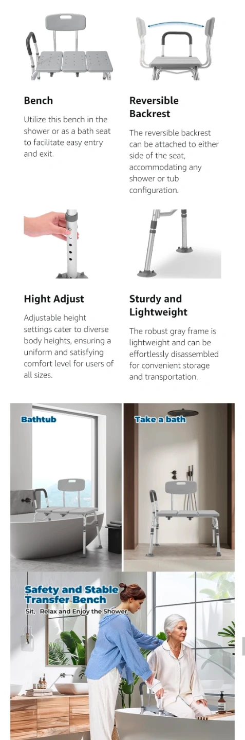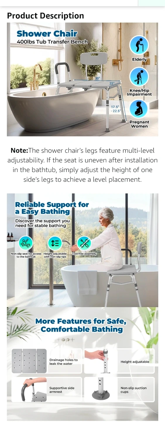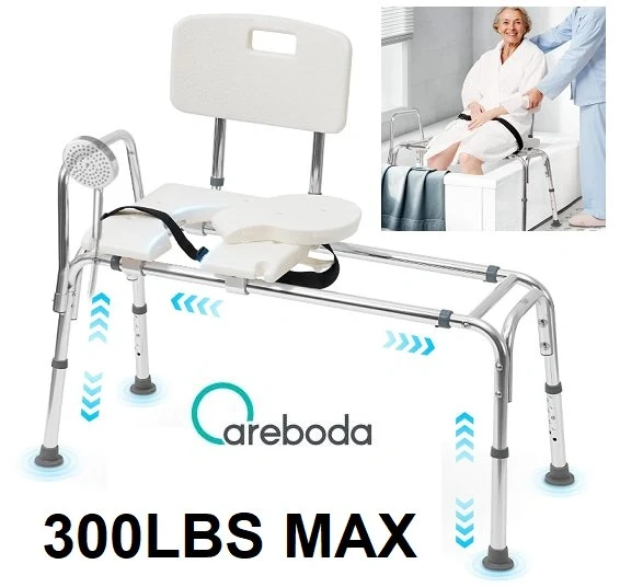 I am selling a Careboda tub transfer bench and shower chair designed for seniors. The bench is brand new. It comes with adjustable features including a backrest and soft arm support, and has a 400 lb weight capacity.