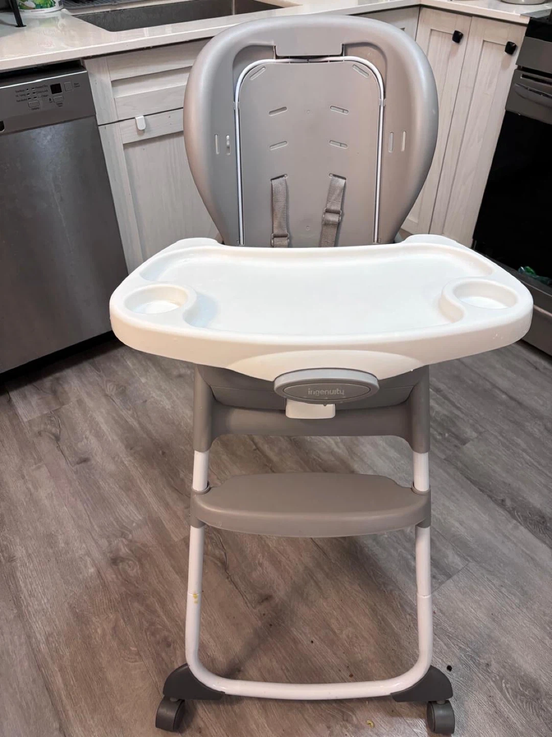 This Ingenuity high chair is grey and white. It has a removable tray with cup holders and a 5-point harness for safety. The seat pad is wipeable for easy cleaning. The chair has wheels for mobility.