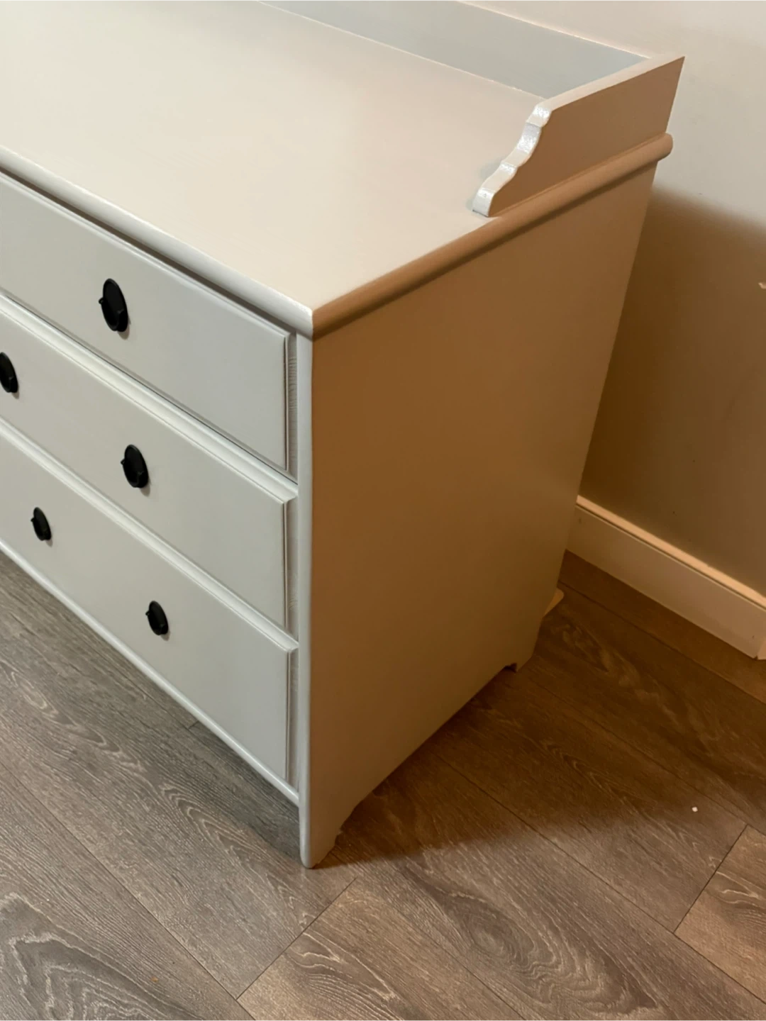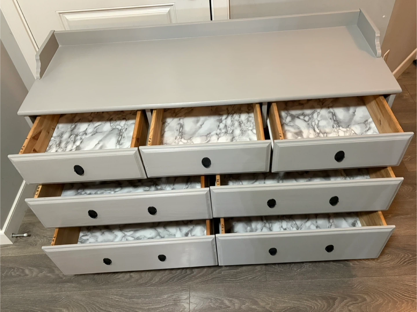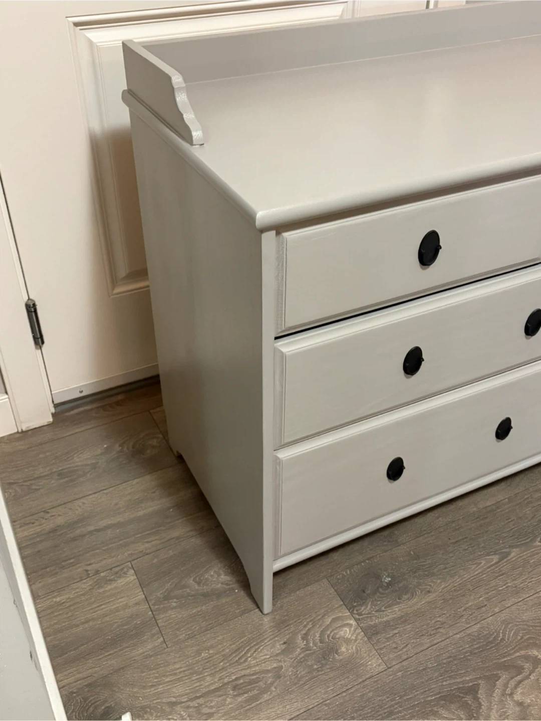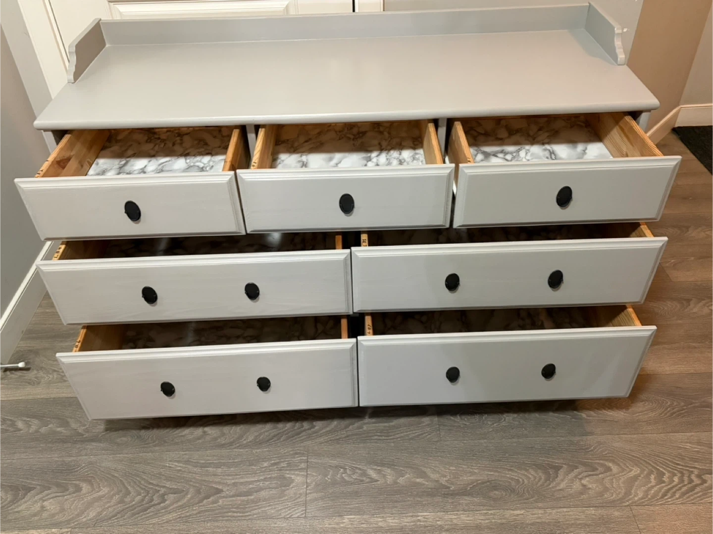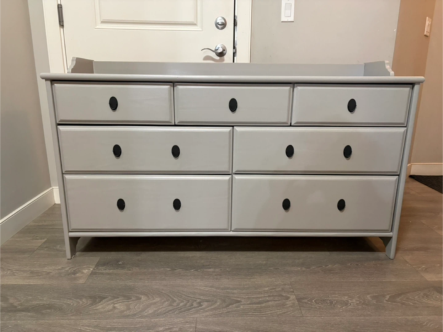 This stylish refinished grey dresser features seven drawers, perfect for organizing clothes and essentials. It is in great shape and ready for a new home. The drawers are very clean and slide smooth on rolls. All the drawers have new liners and very clean.