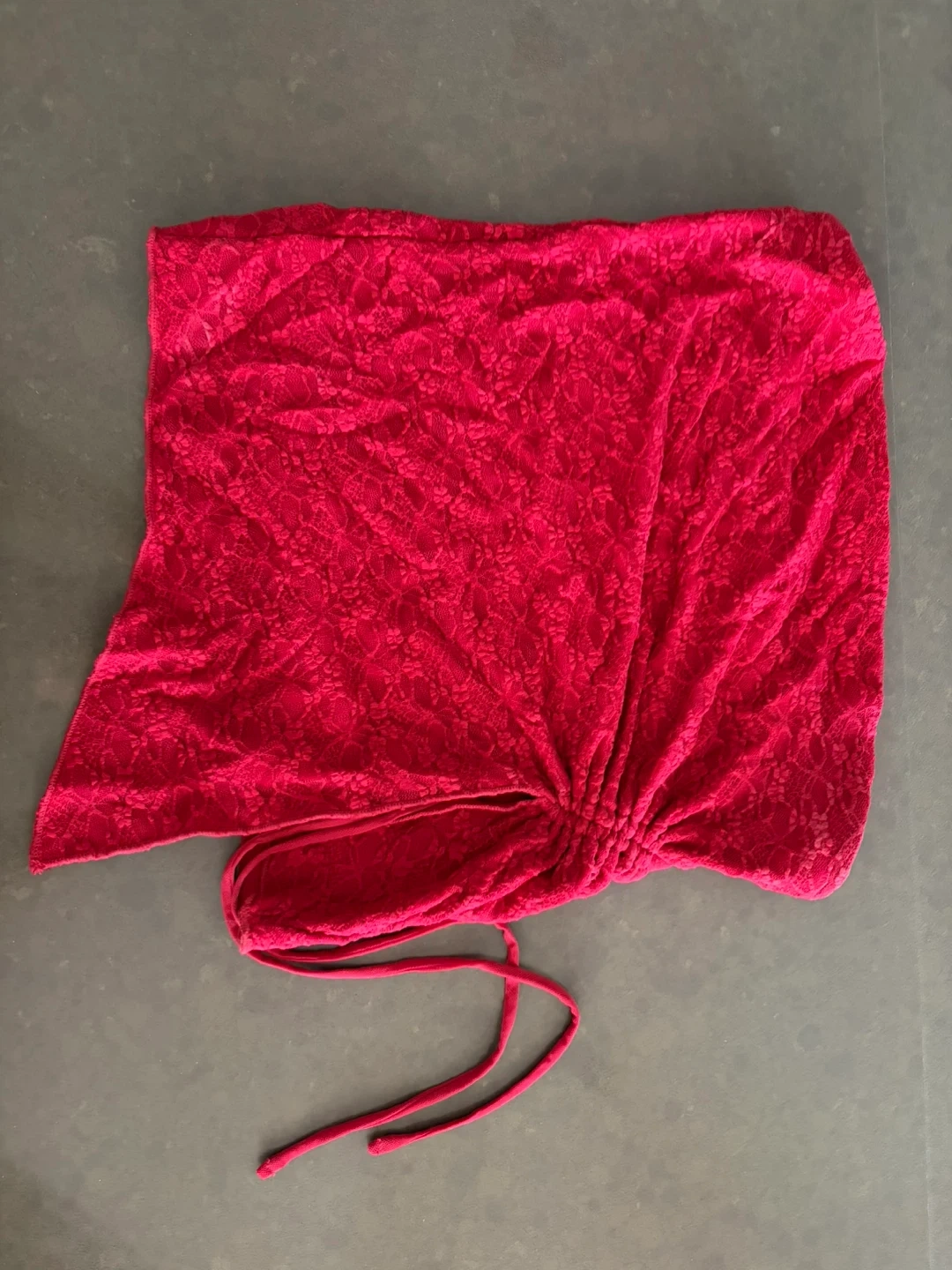 Tube top in a vibrant pink lace fabric. It features a gathered detail with drawstrings at the front. This top offers a unique and stylish look.