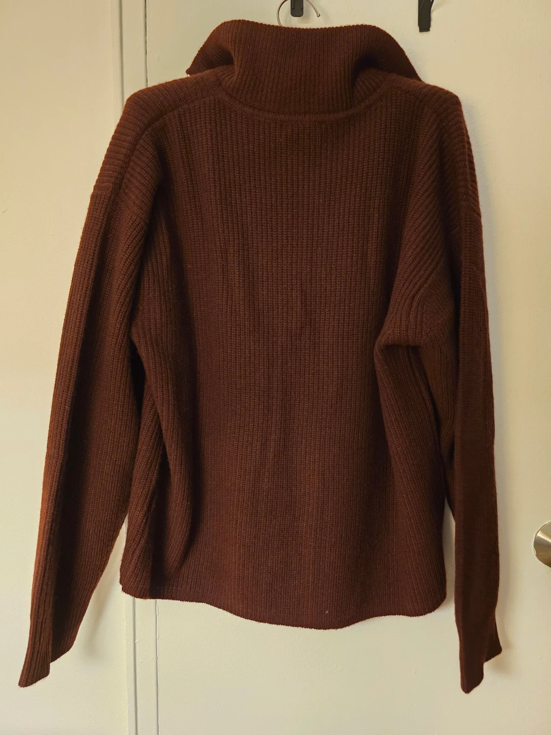 Women Quince Mongolian Cashmere Fisherman Quarter Zip Sweater in rich burgundy. 100% Mongolian Cashmere. Size medium. It has a quarter zip closure and a cozy knit design. Perfect for cooler weather!