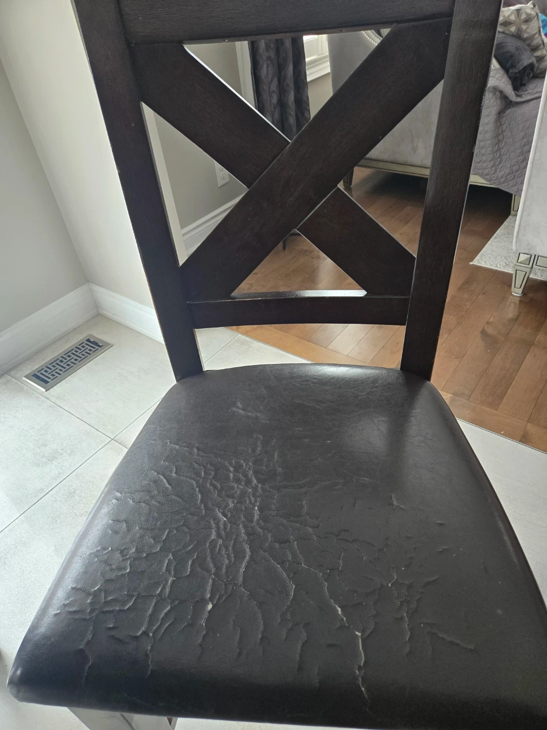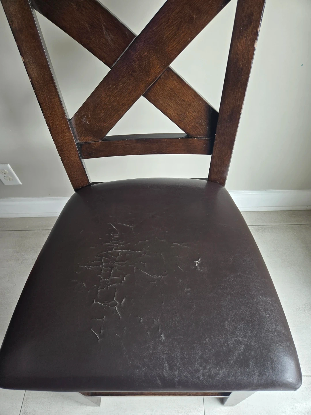 This dark wood dining chair has a brown faux leather seat. The seat shows some signs of wear and tear, with cracking and a small rip. Wood frame with a distinctive criss-cross back design.