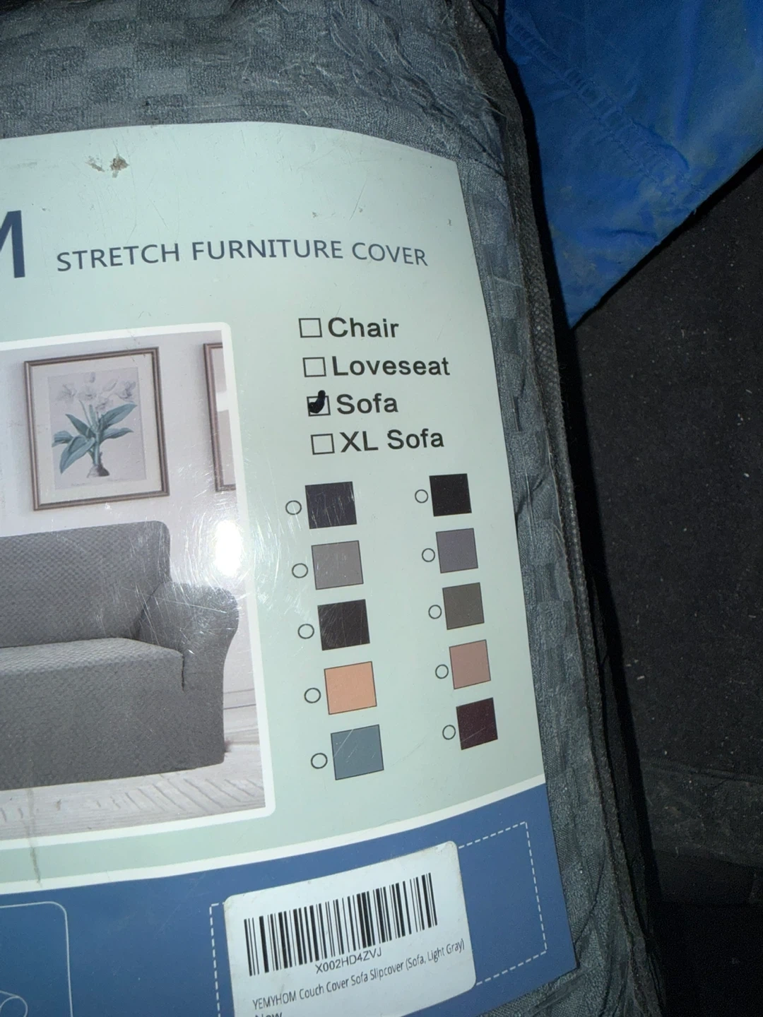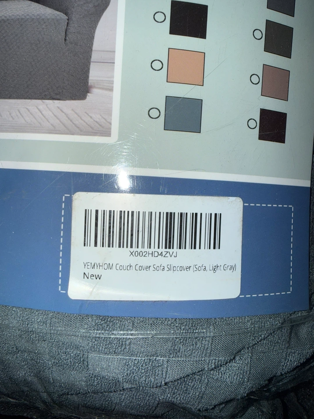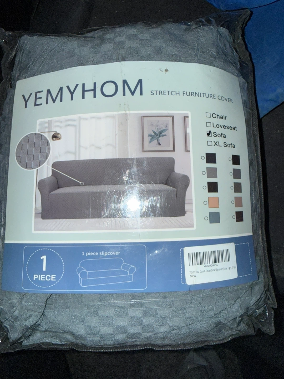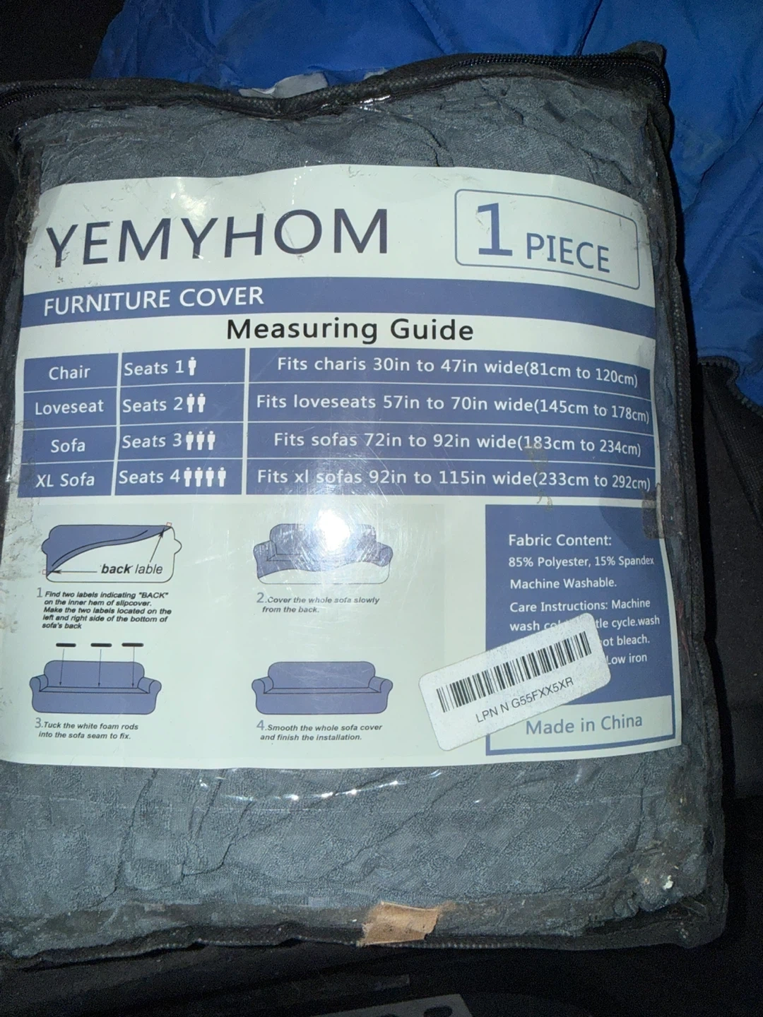 This is a YEMYHOM stretch furniture cover for a sofa. It's made from 85% polyester and 15% spandex fabric. The cover fits sofas from 72in to 92in wide. Machine washable, gentle cycle, low iron.