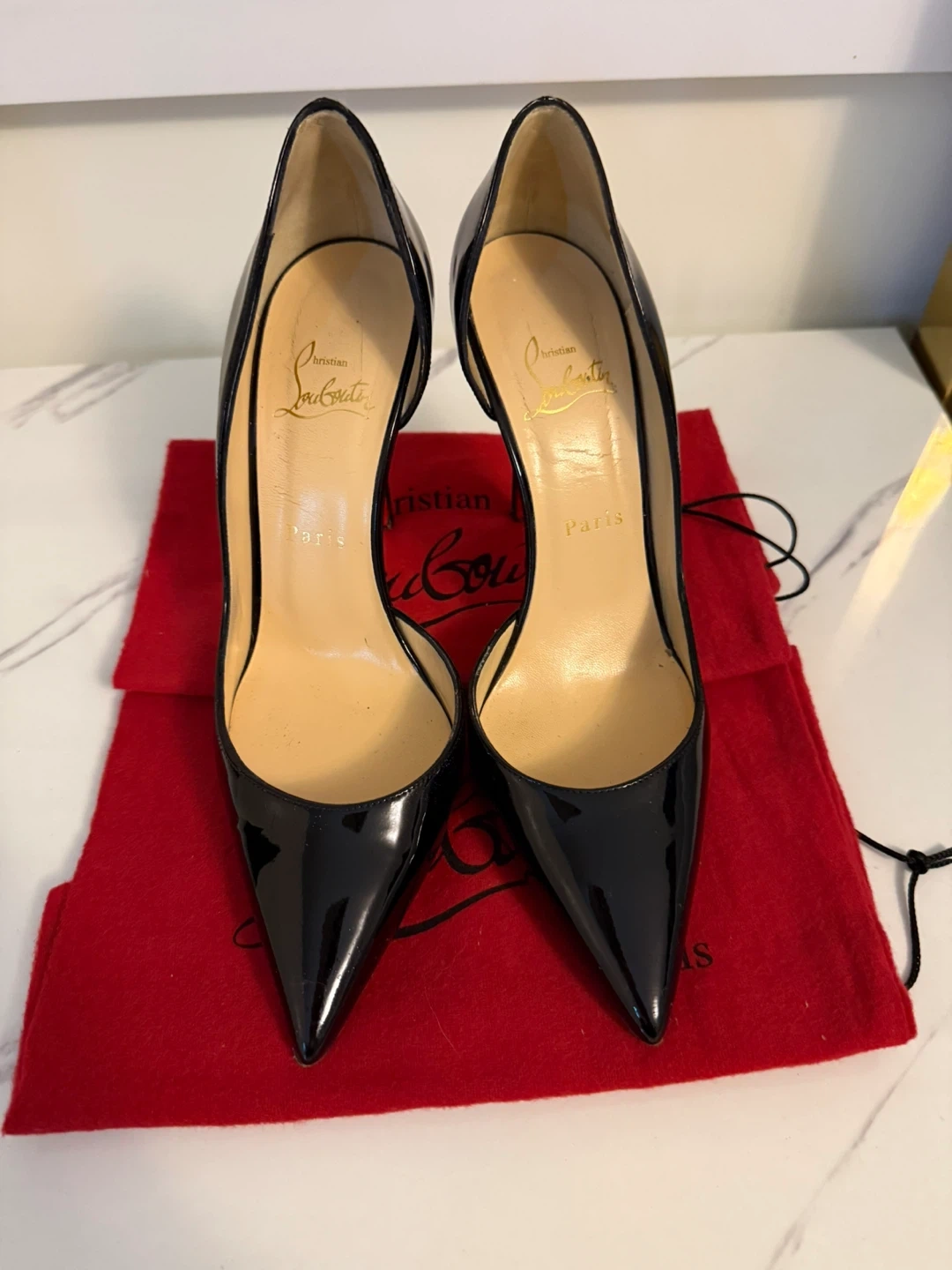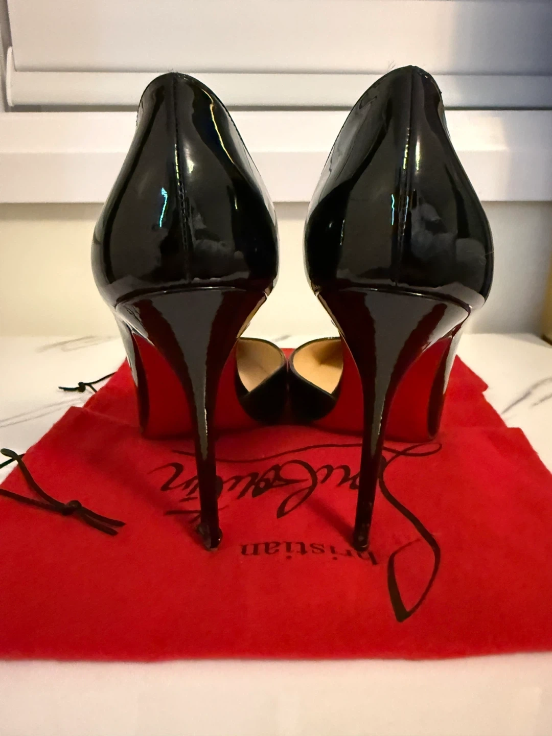 Classic Christian Louboutin heels in black patent leather. Comes with dust bags and original box. These iconic shoes are made in Italy.