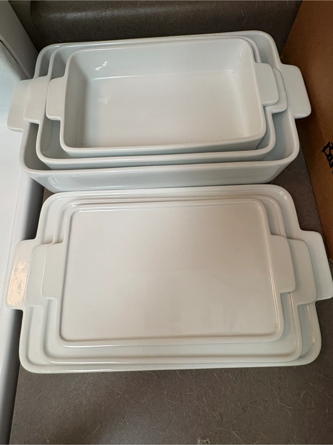 Set of 3 white ceramic rectangular baking dishes with covers. Dishwasher and microwave safe.