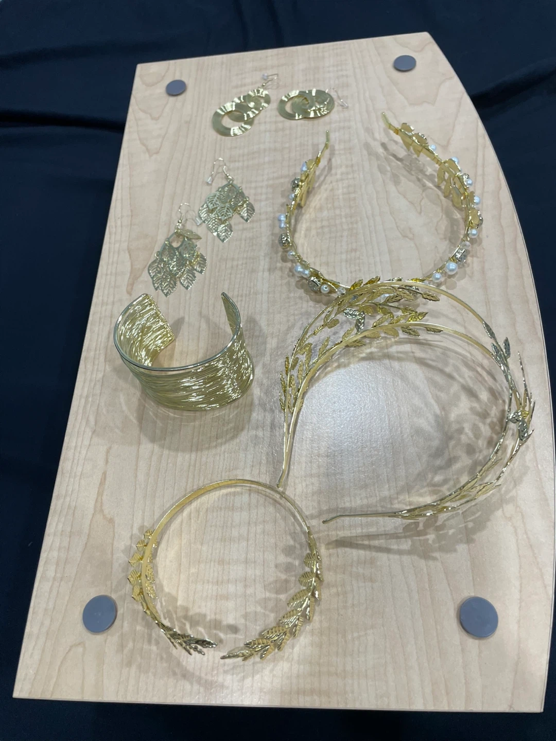 This is a set of gold-tone accessories. It includes 2Pcs gold leaf crowns, 2 pairs dangle earrings, 1pcs golden upper arm coil cuff armlet & 1pcs leaf upper armbands. The designs feature leaf motifs and pearl accents. It's a lovely collection for special occasions!