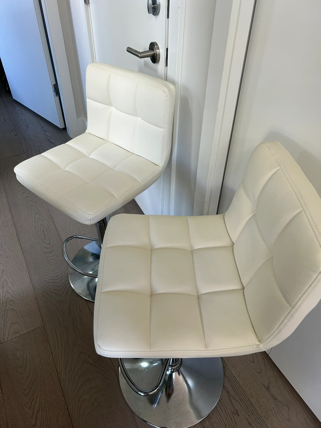 Selling a set of two white bar stools. They're adjustable in height and swivel 360 degrees. The seats are cushioned and upholstered in faux leather with a tufted design. Chrome base and footrest.