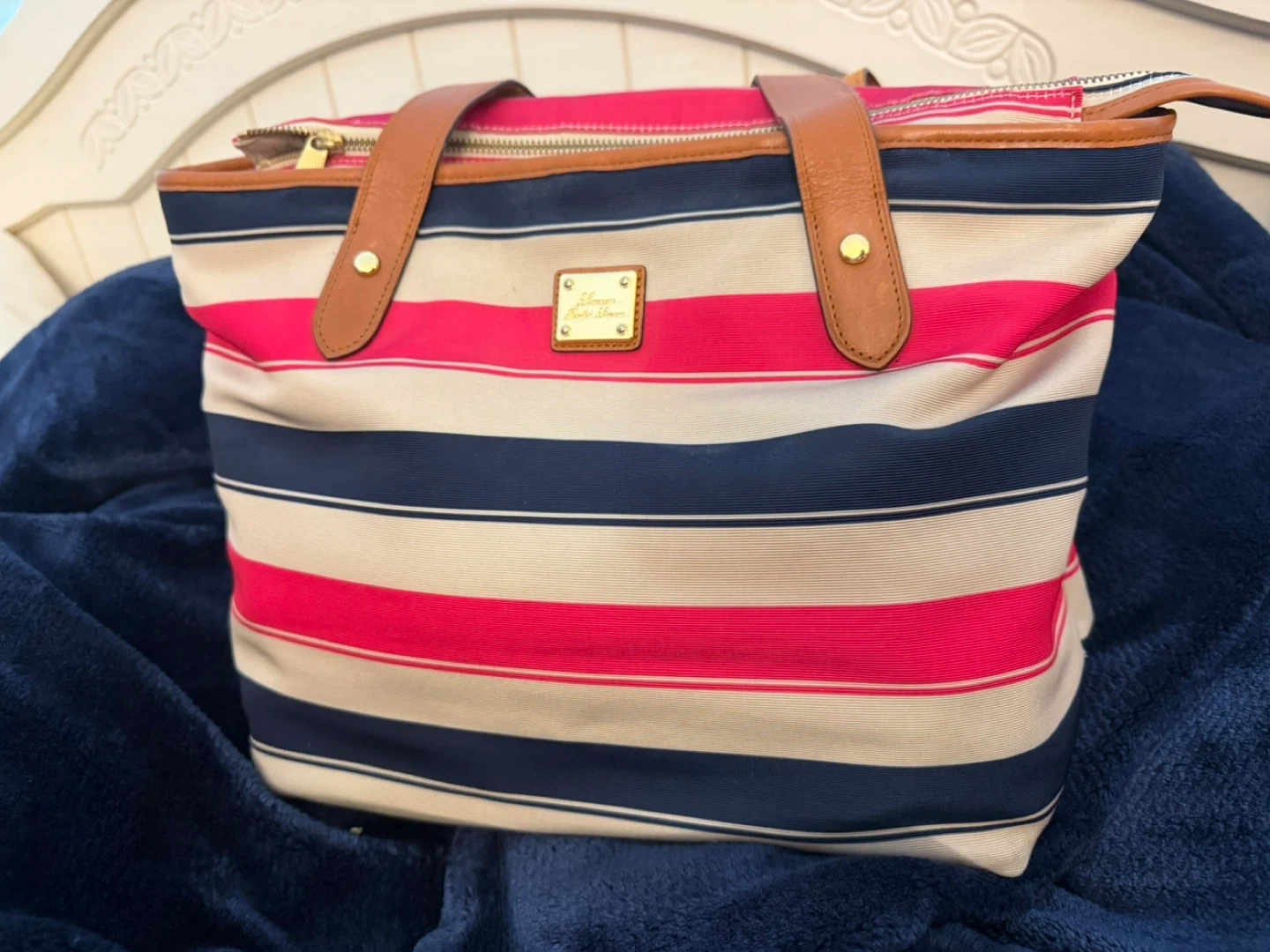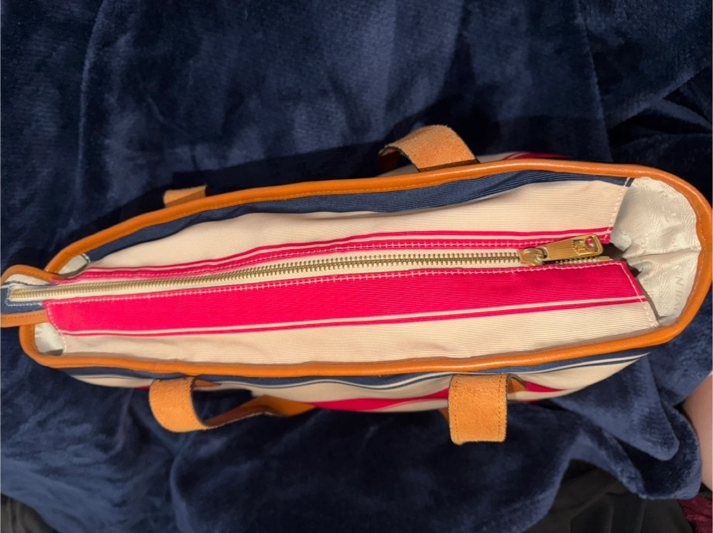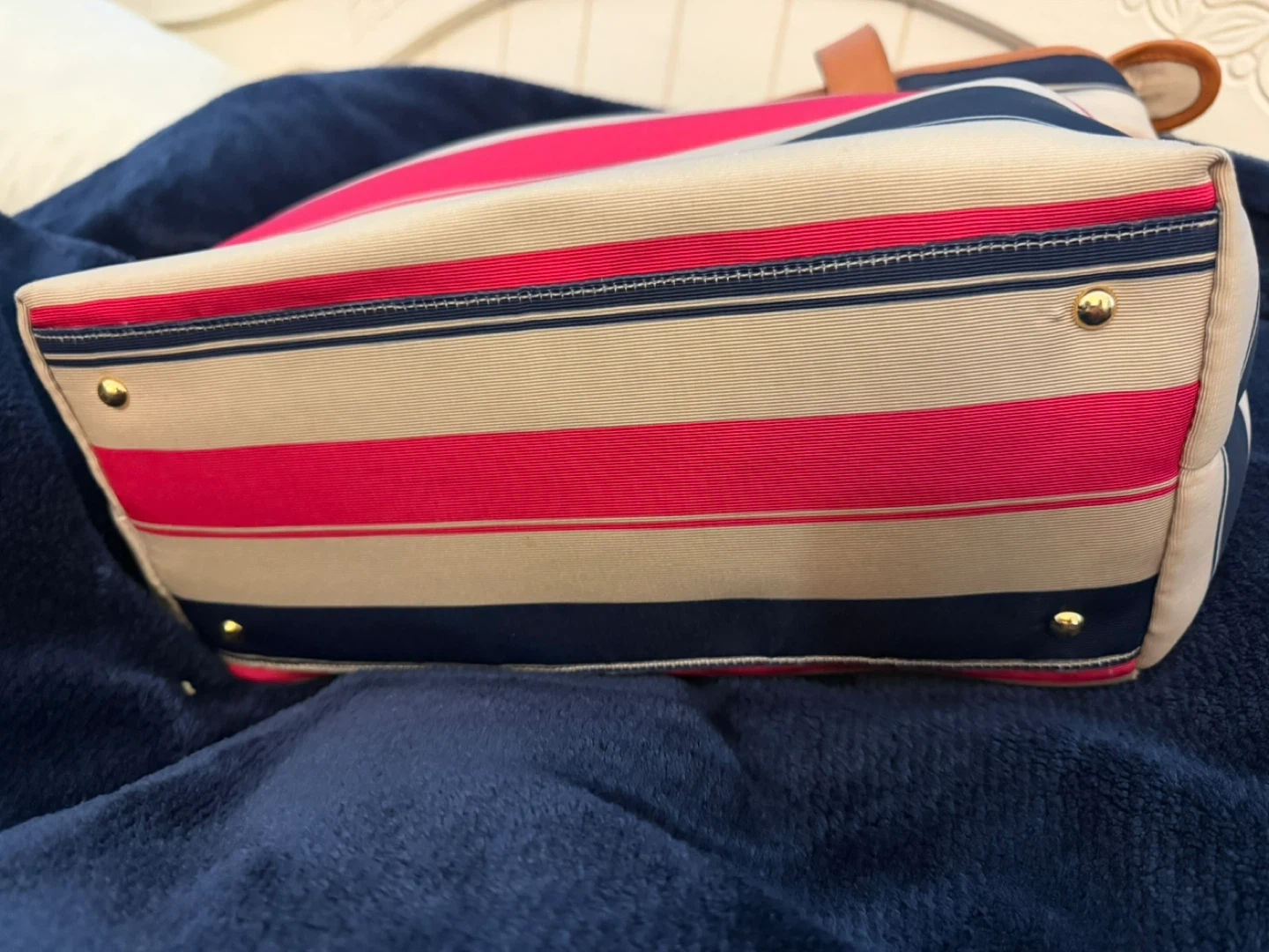 This is a Lauren Ralph Lauren tote bag with a colourful stripe pattern. It features comfortable leather handles and a secure zippered closure. The interior has multiple pockets for organization.