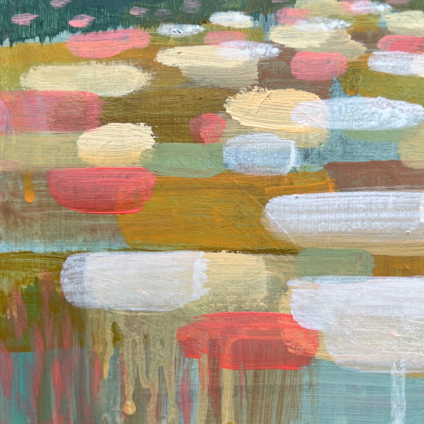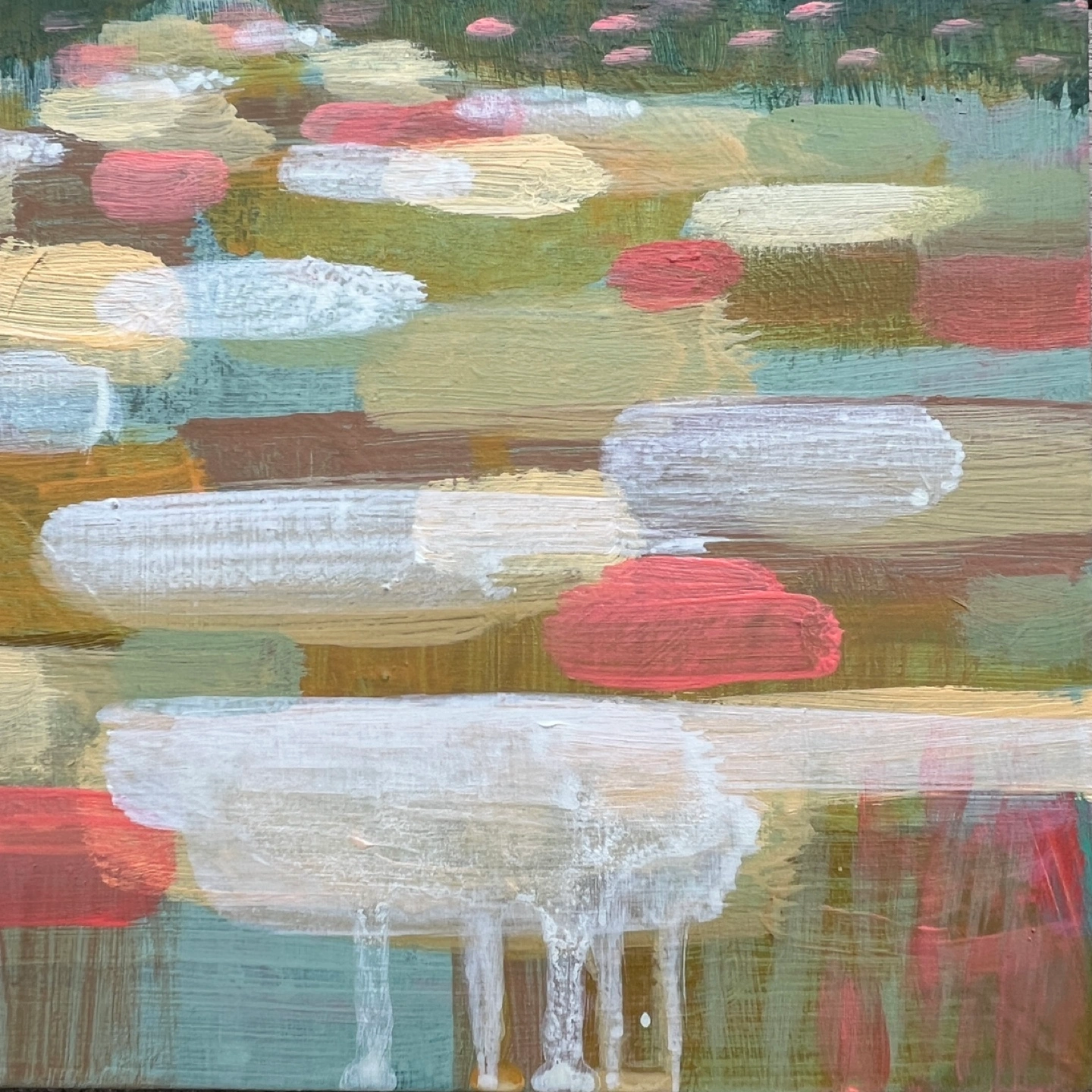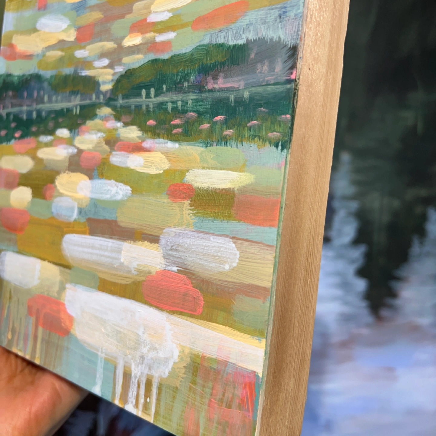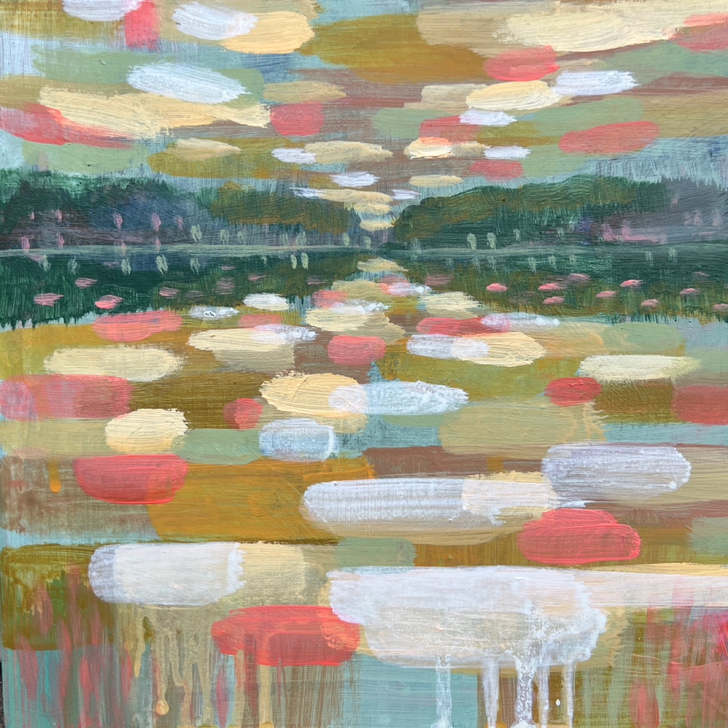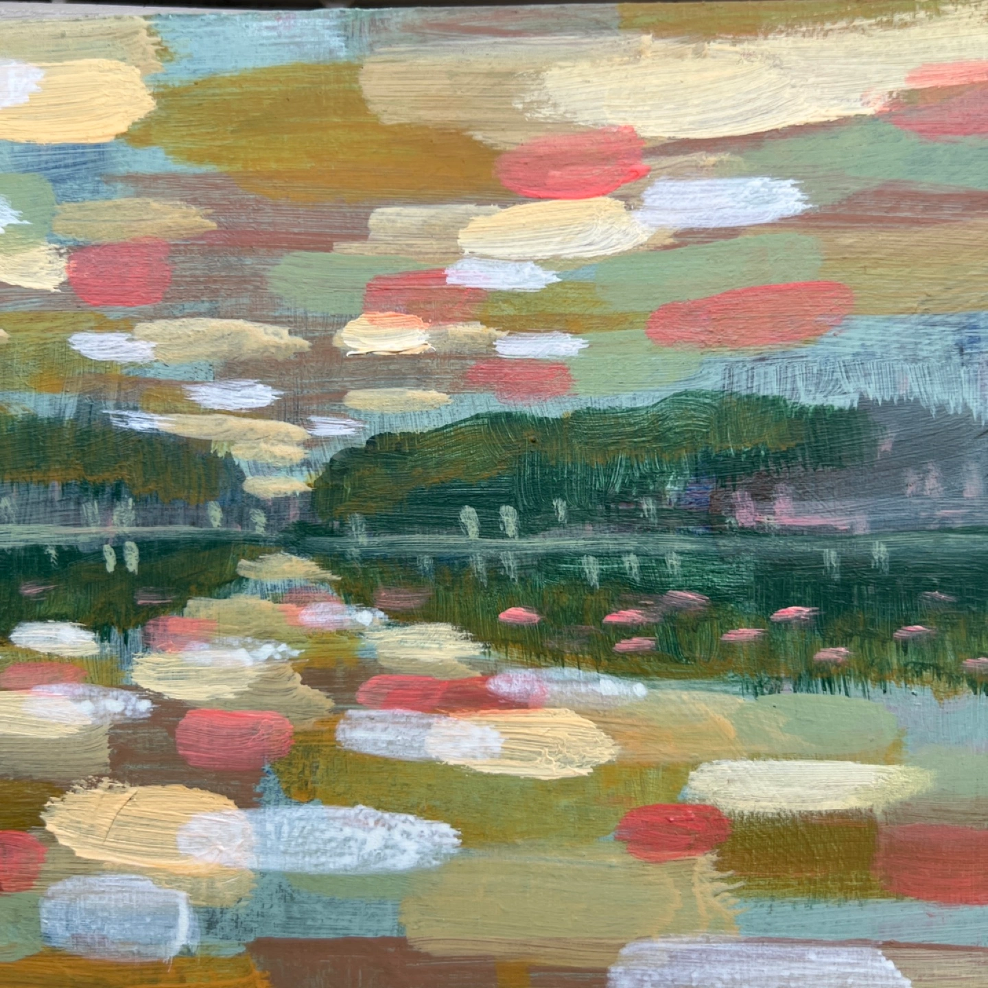 Small, colourful landscape painting. Features a lake scene with trees and sky. Painted with acrylics on a wood panel. Unique and expressive style.