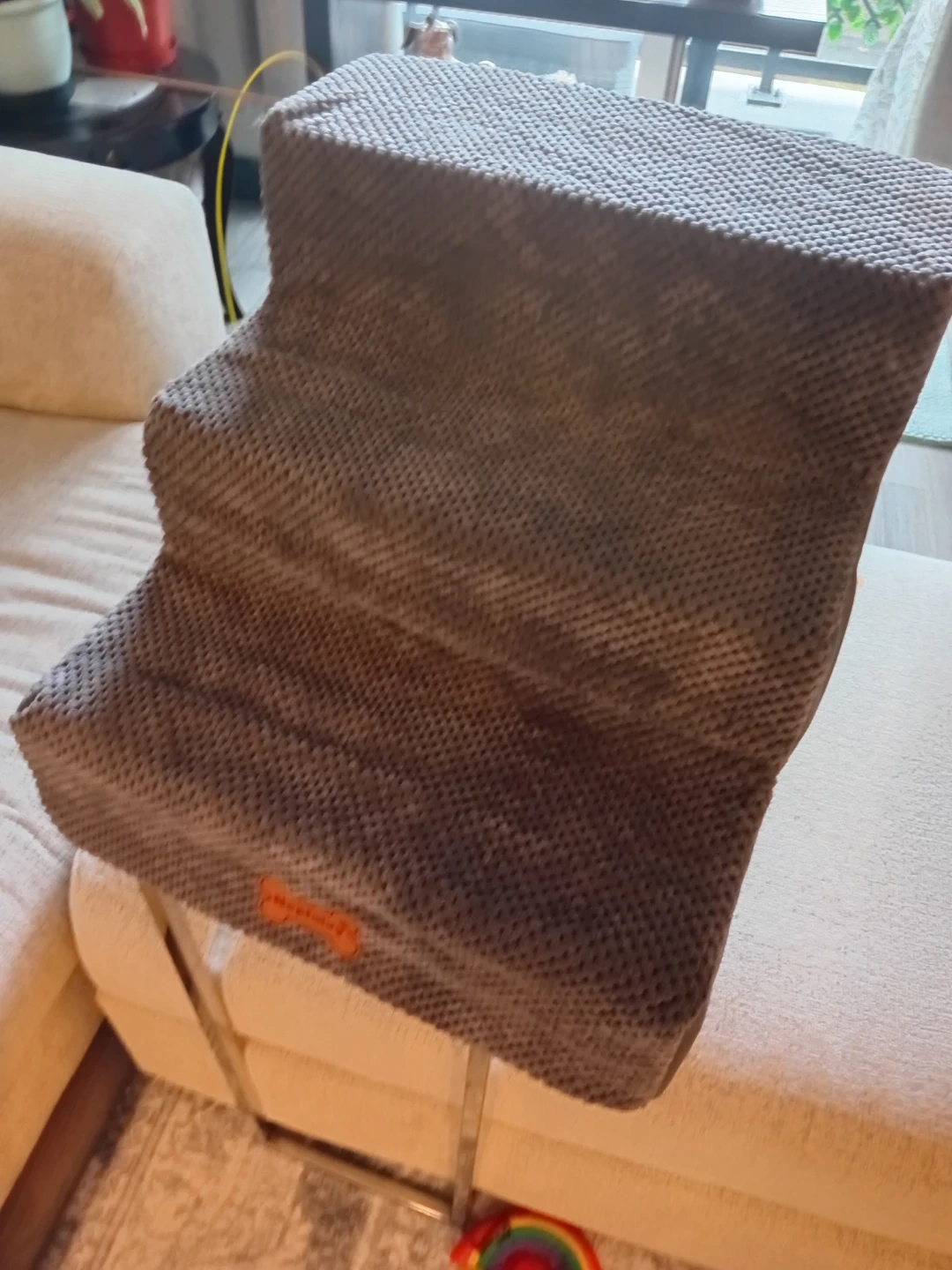 Grey pet steps to help small or older pets reach higher places like couches or beds. The textured fabric offers good grip. It's perfect for pets who have trouble jumping!