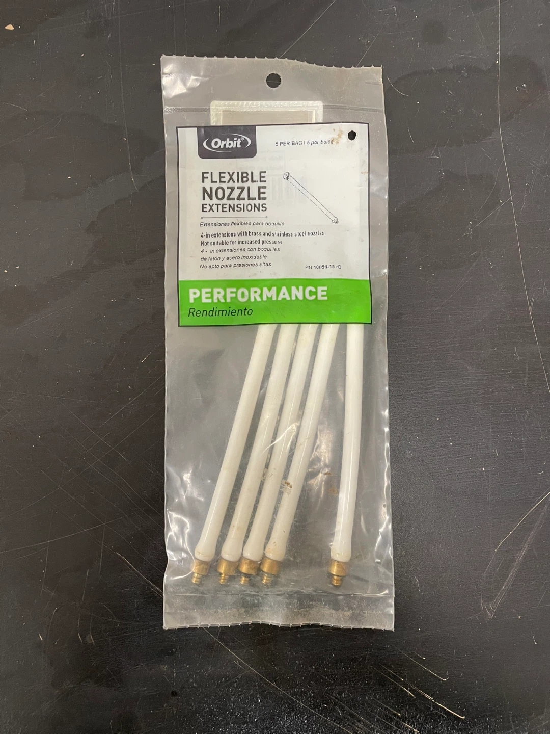 $5 each or $30 for all four. This is a 5-pack of Orbit flexible nozzle extensions. They're designed for pressure washers. Made with brass and stainless steel tips.