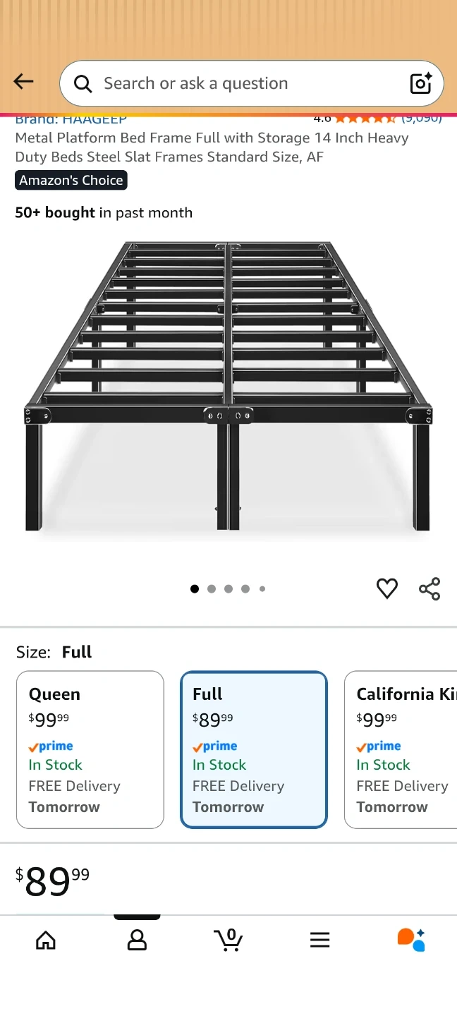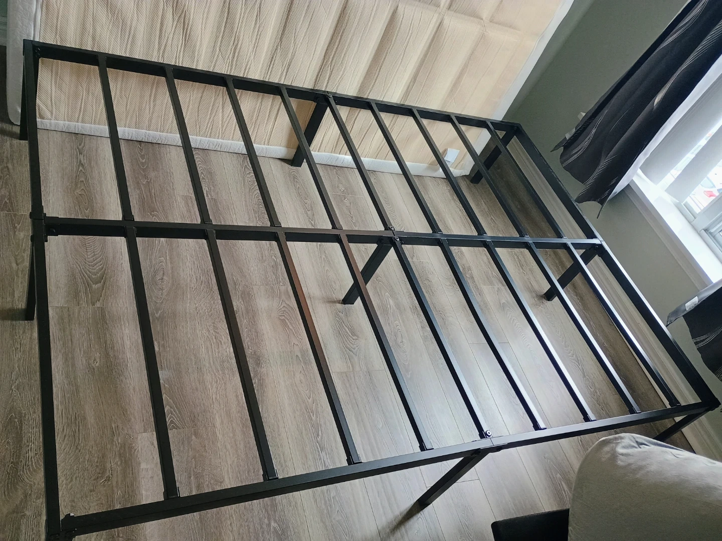 Metal platform bed frame. Not the exact one shown from Amazon but same idea..It's 14 inches high with under-bed storage space. Constructed with sturdy steel slats for reliable support. Practically New.