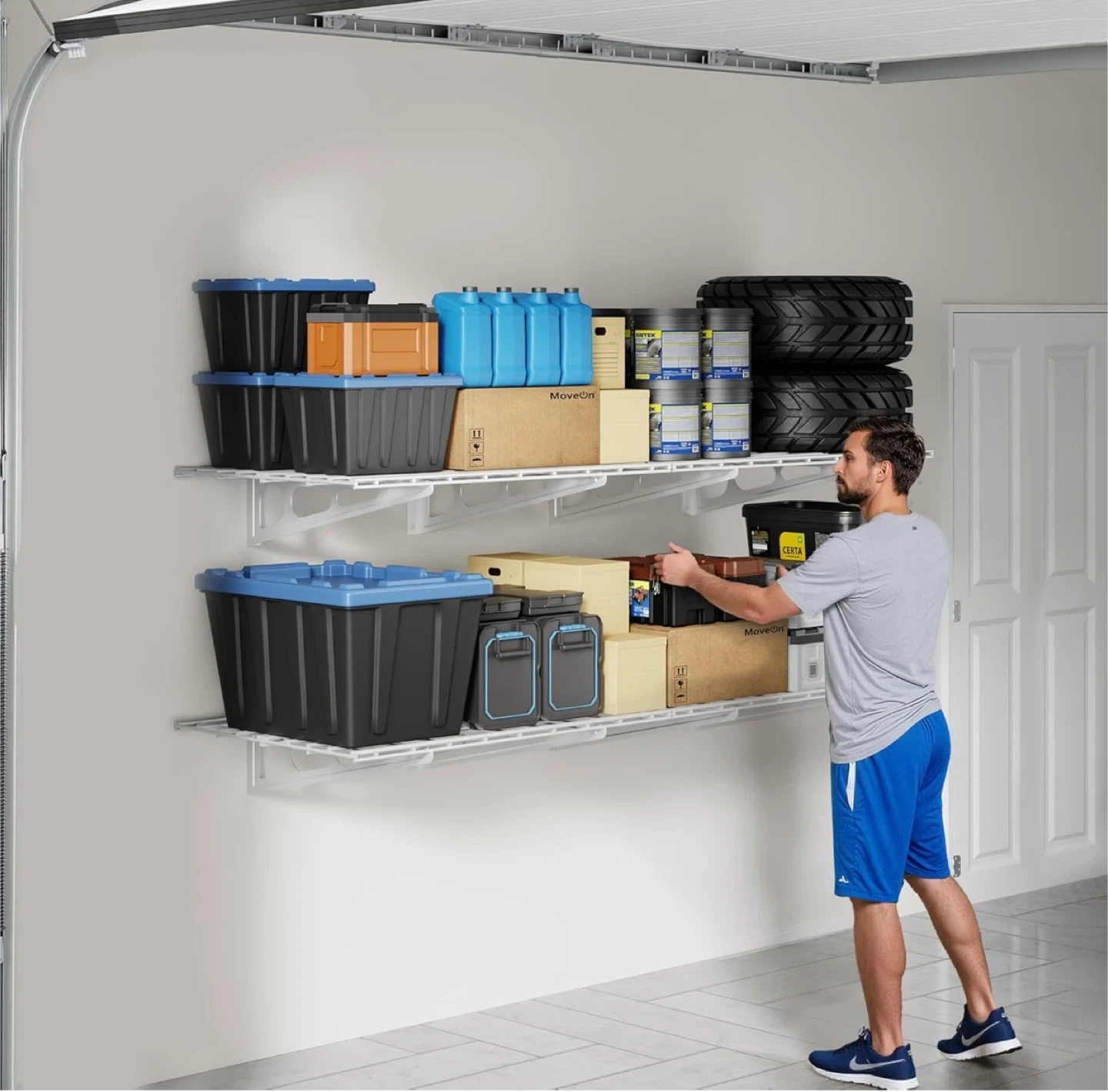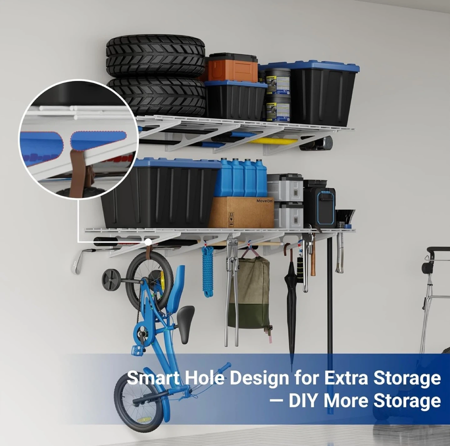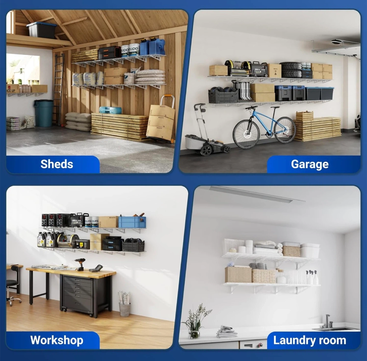 Ideal for organizing tools, storage bins, boxes, and seasonal items.