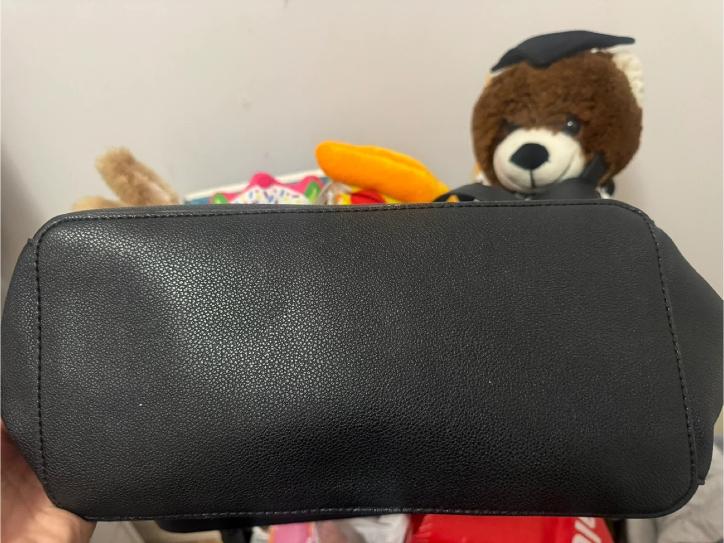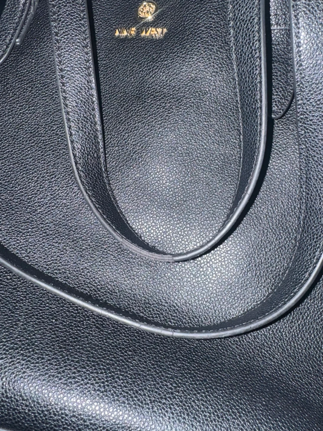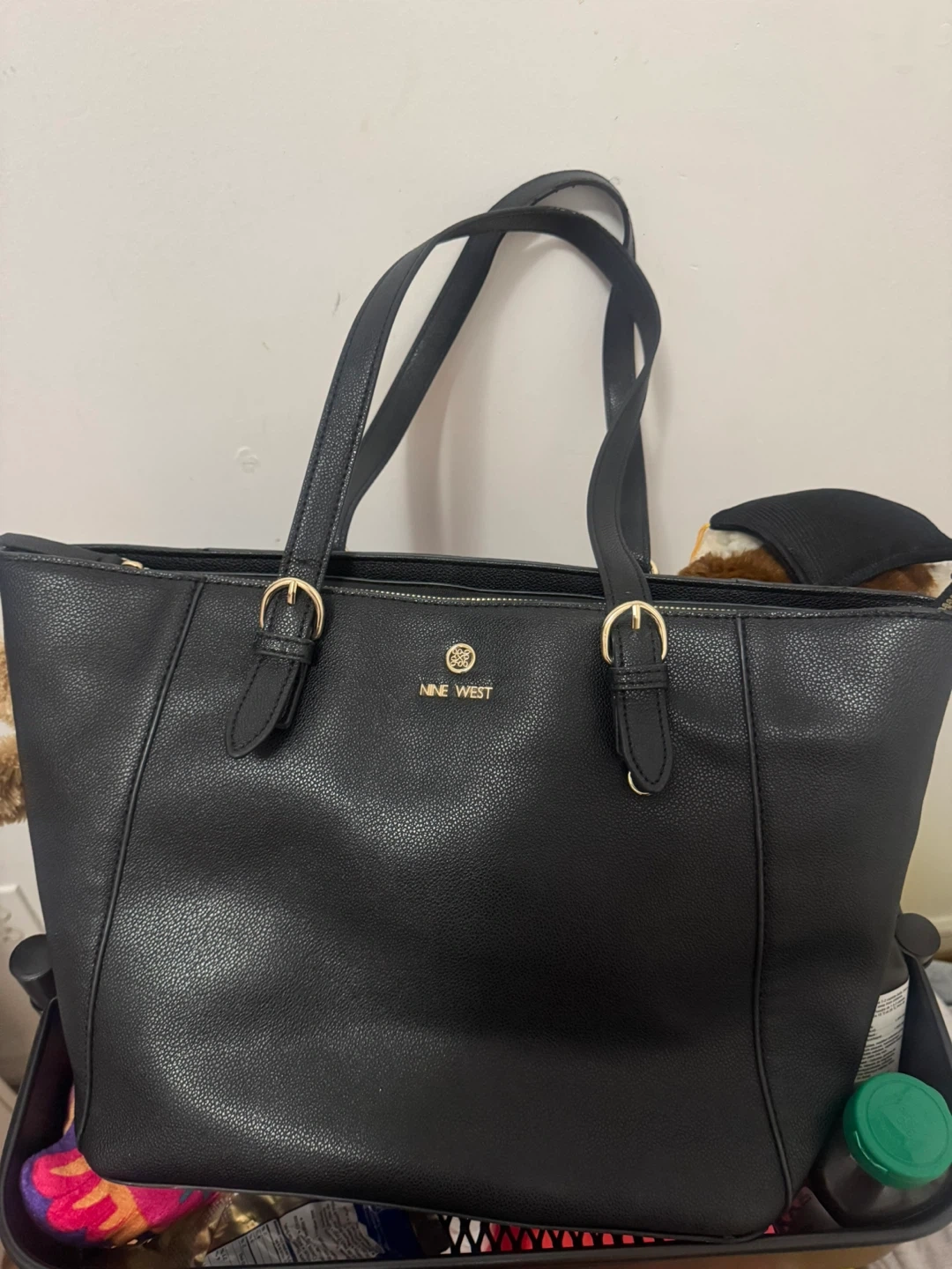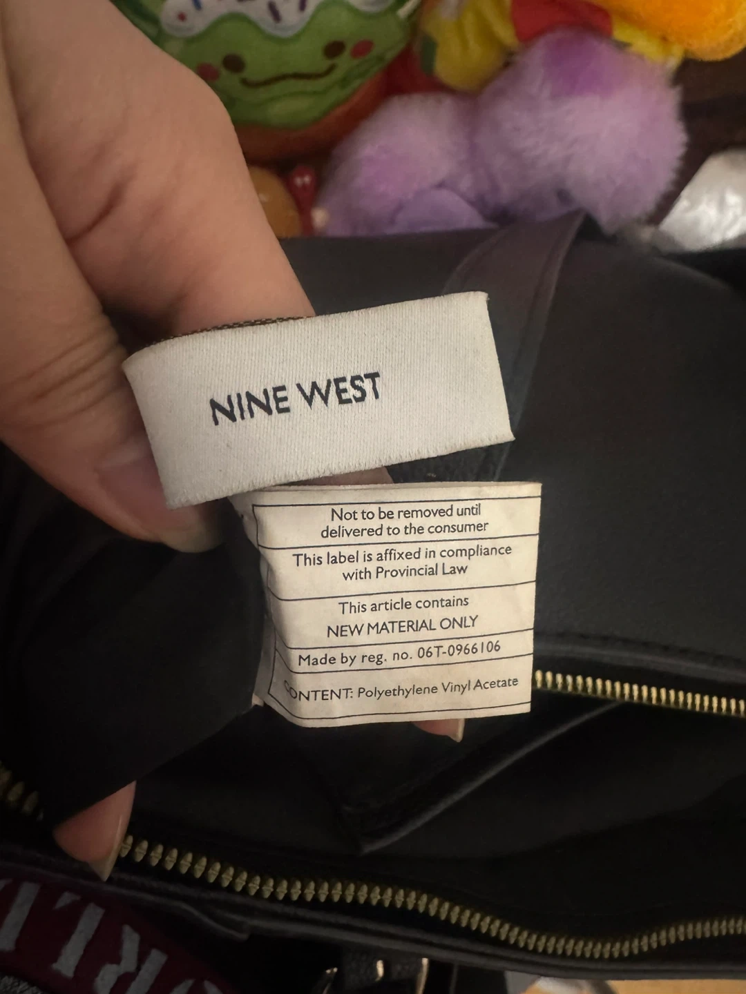 This is a Nine West black tote bag. It's made of Polyethylene Vinyl Acetate. This bag is great for everyday use either to work or school!