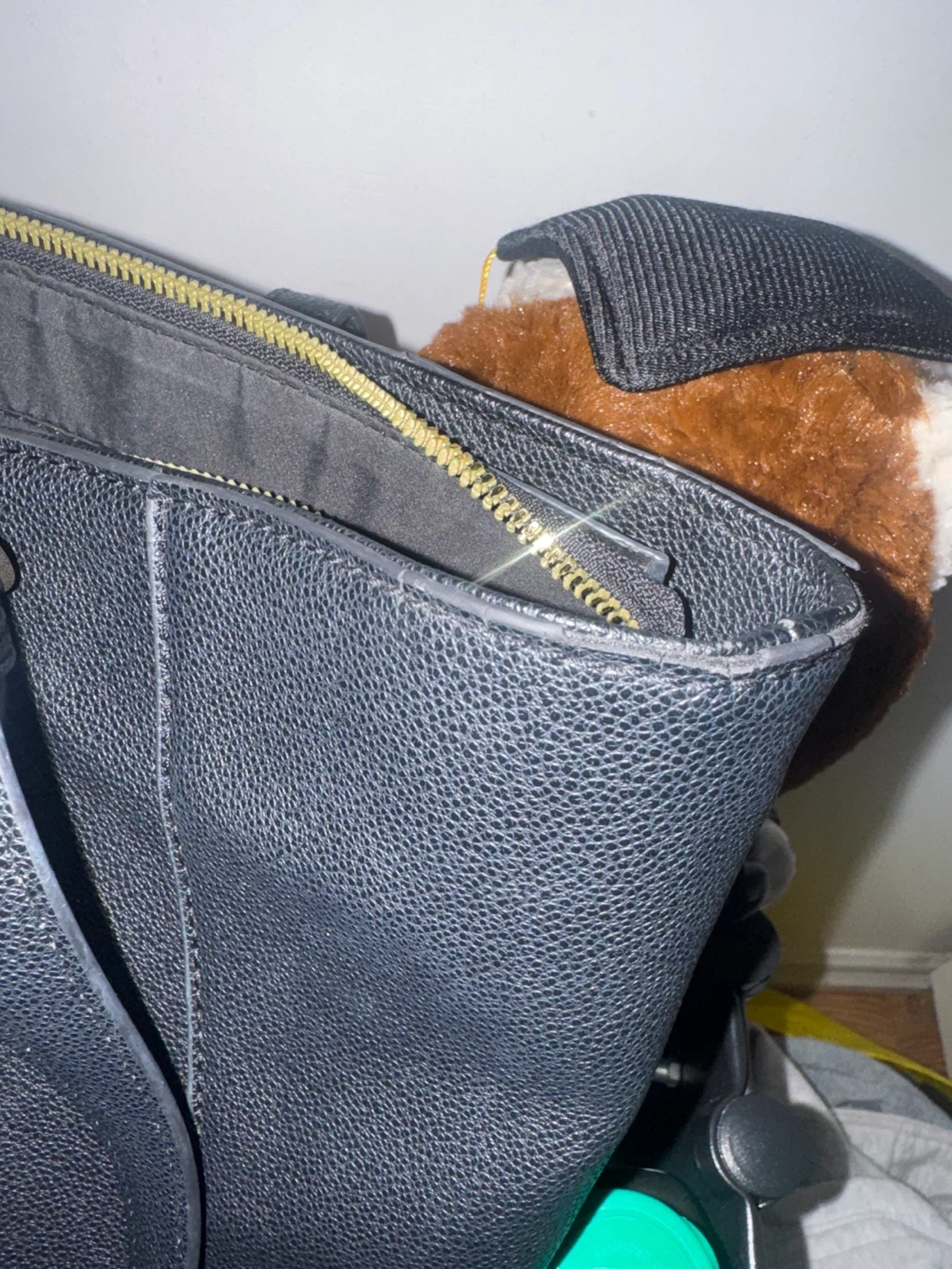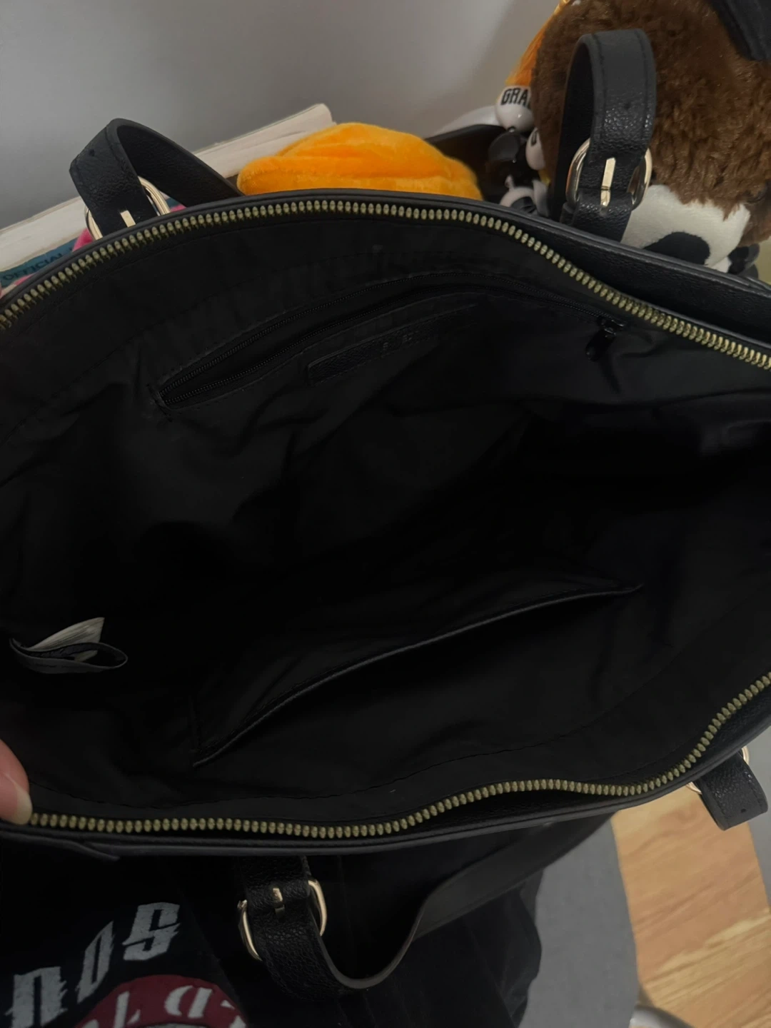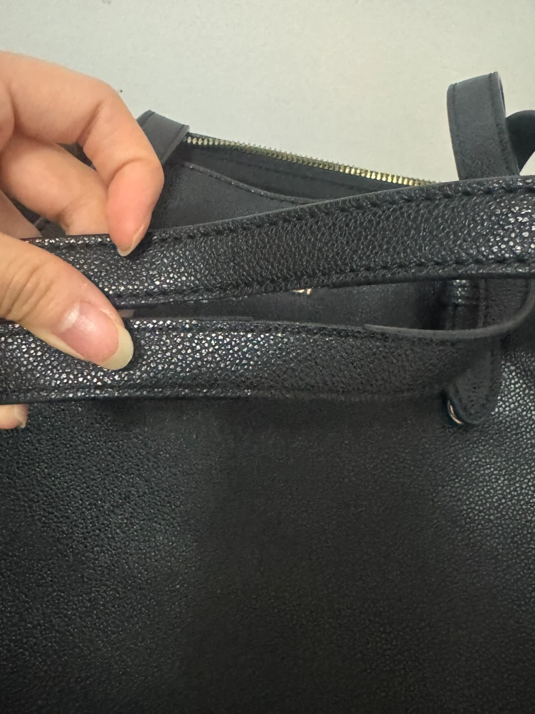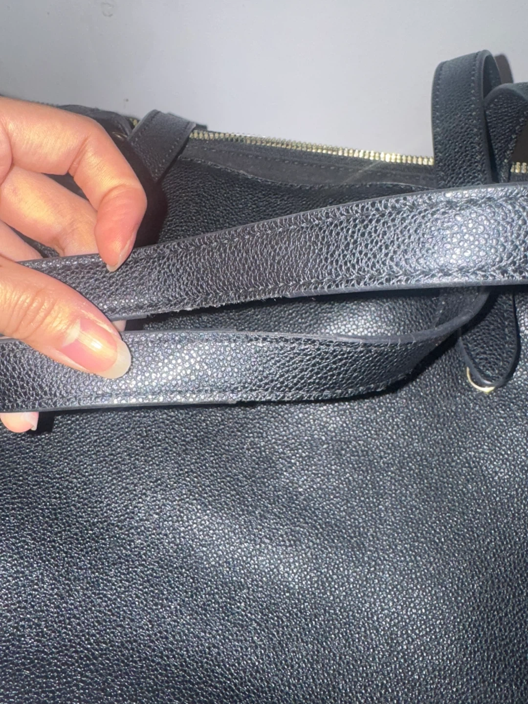 This is a Nine West black tote bag. It's made of Polyethylene Vinyl Acetate. This bag is great for everyday use either to work or school!