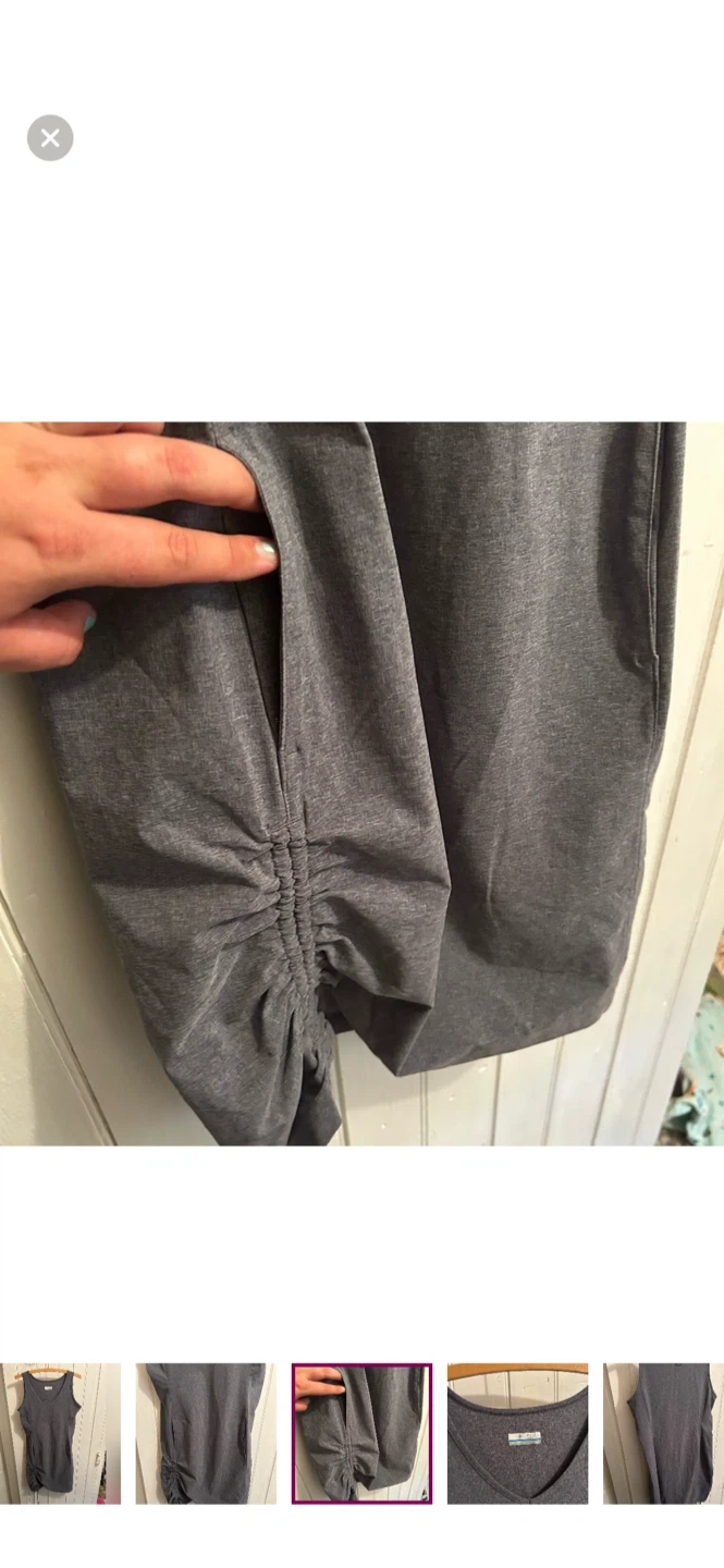 Columbia brand. Sleeveless vneck dress with adjustable side scrunch. Two front pockets. Grey in colour. Size small. Brand new condition