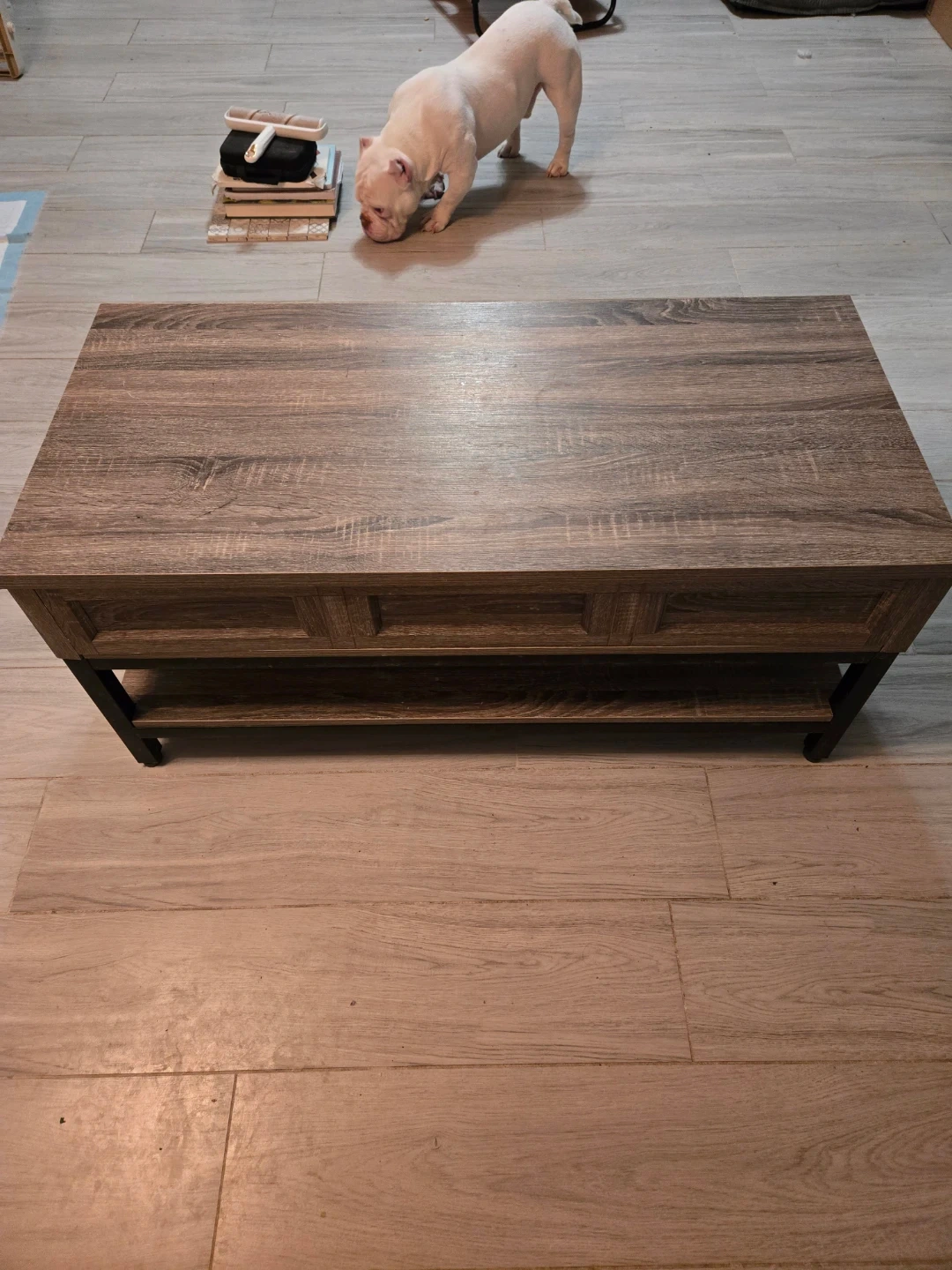 This lift top coffee table offers hidden storage space inside when the top is raised. It features a lower shelf for additional storage. The tabletop is a rustic wood finish with black metal legs. It's a functional piece for any living room!