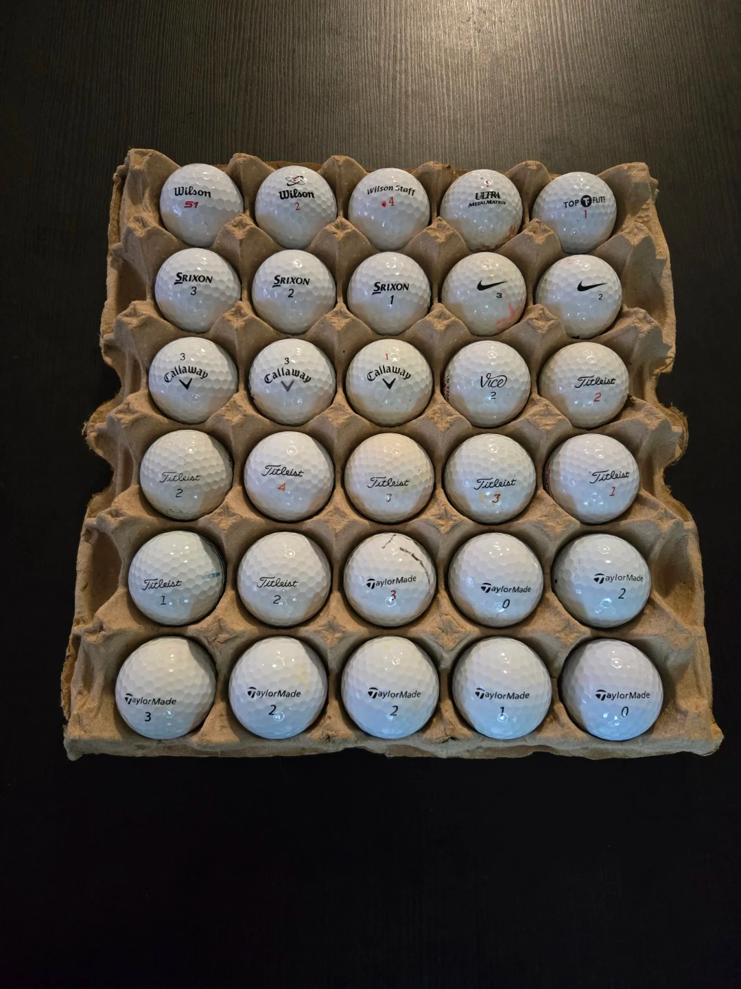 A couple Srixon Zstar, a couple Titleist pro V1, a Taylormade TP5, a Vice pro plus and others.