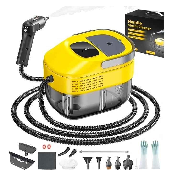 This handle steam cleaner comes in bright yellow. It features 3-level adjustable steam and a 1.4L water tank. Includes a variety of attachments for cleaning different surfaces.