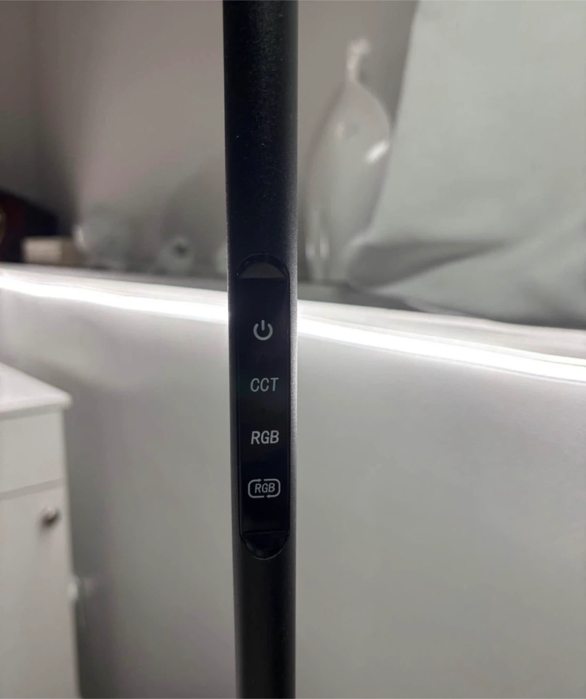 This floor lamp features adjustable CCT and RGB colour settings. It's a sleek, modern design that's perfect for adding ambient lighting to any room. The lamp offers multiple colour options for customized mood lighting. It's easy to operate with controls on the stem.