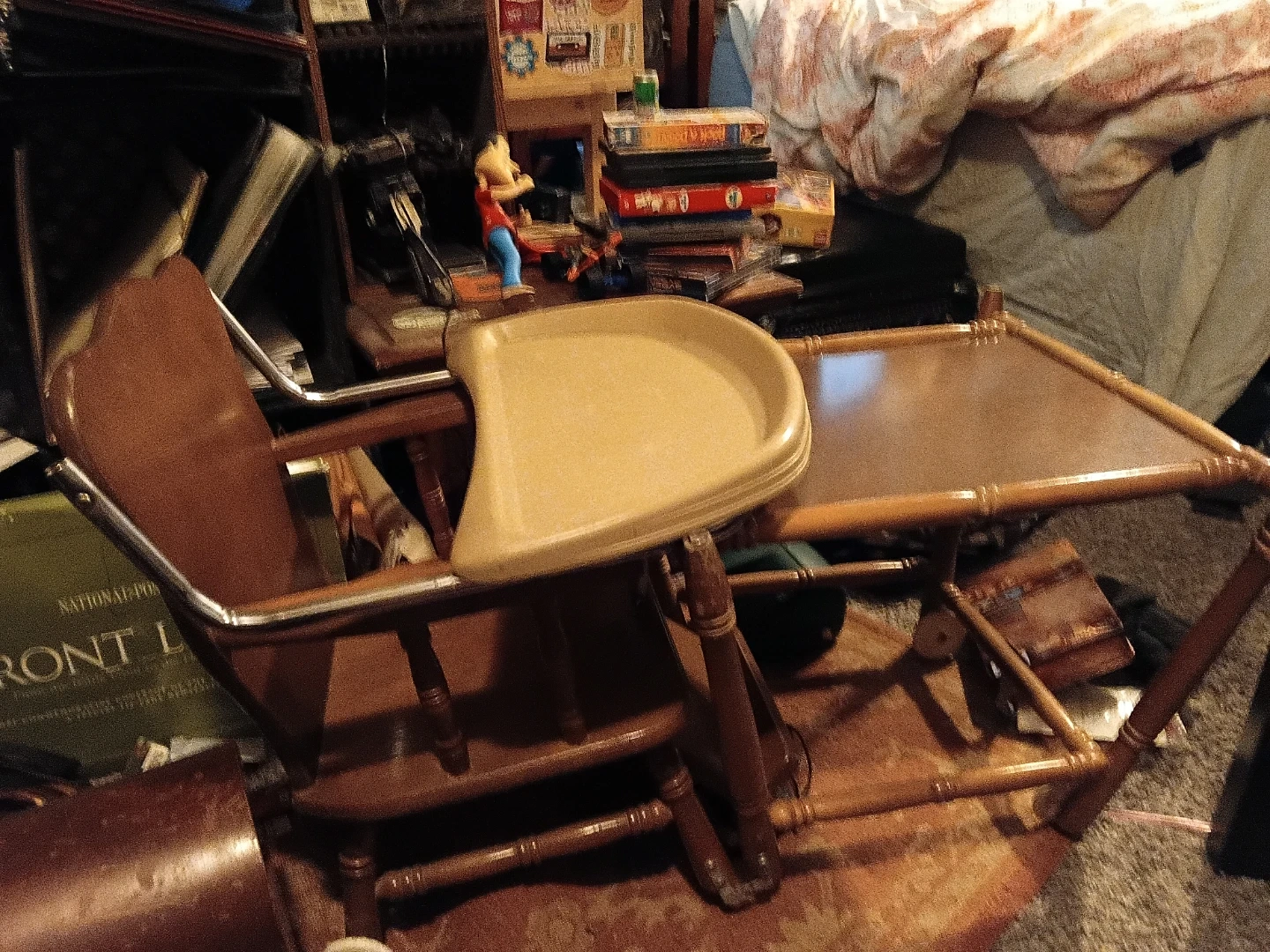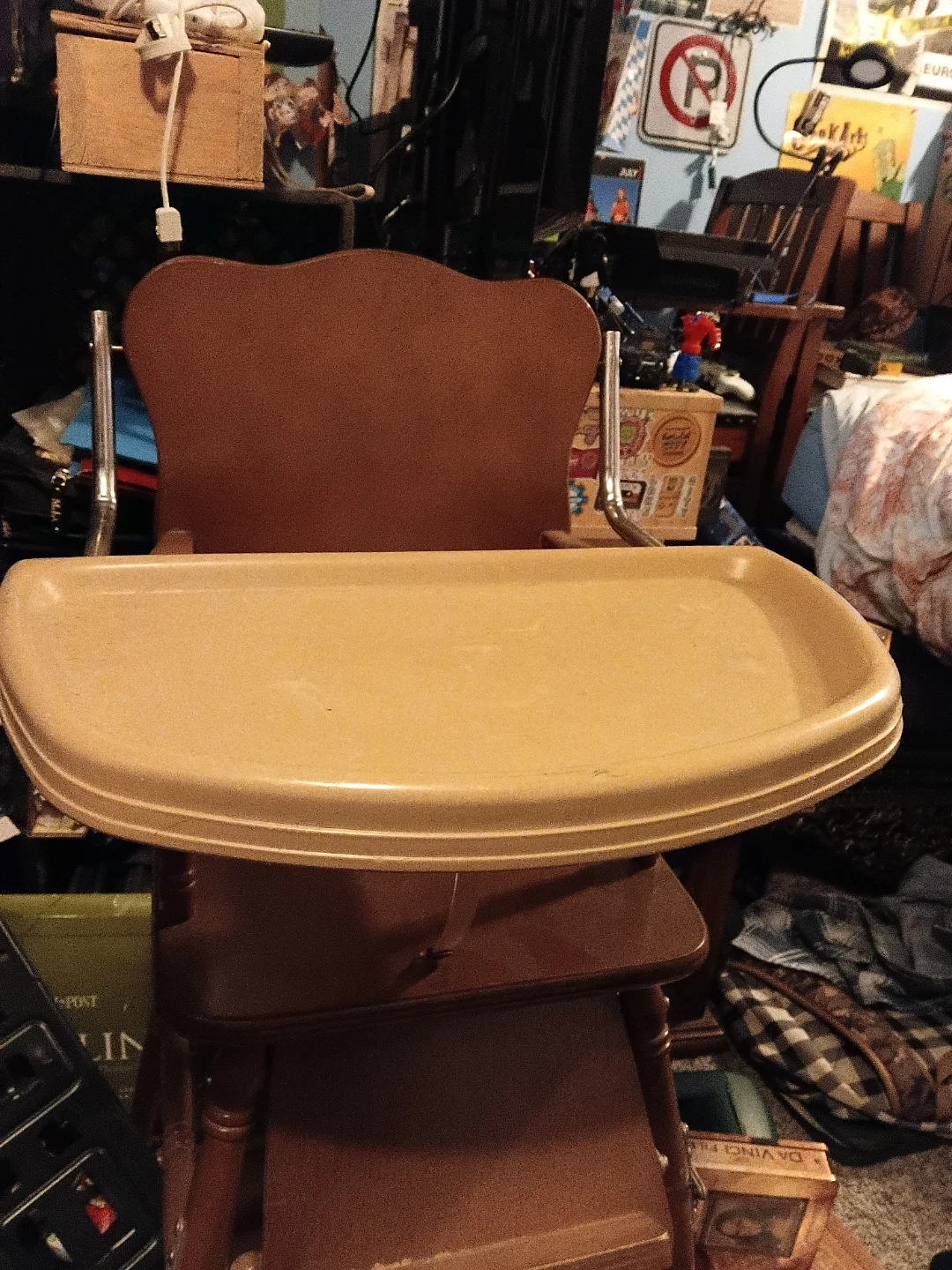 Classic wooden high chair with a removable plastic tray. This chair features a sturdy wood construction and a comfortable seat. It's designed for feeding little ones. Antique, vintage