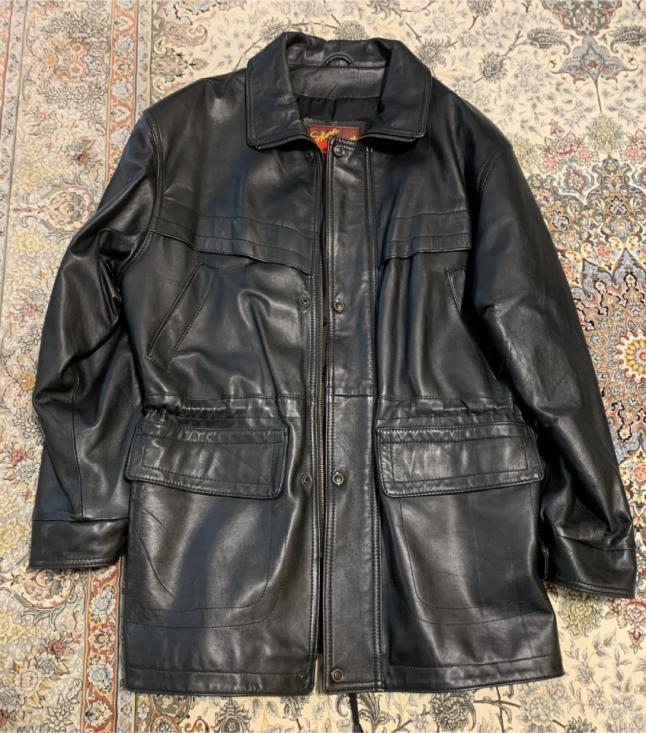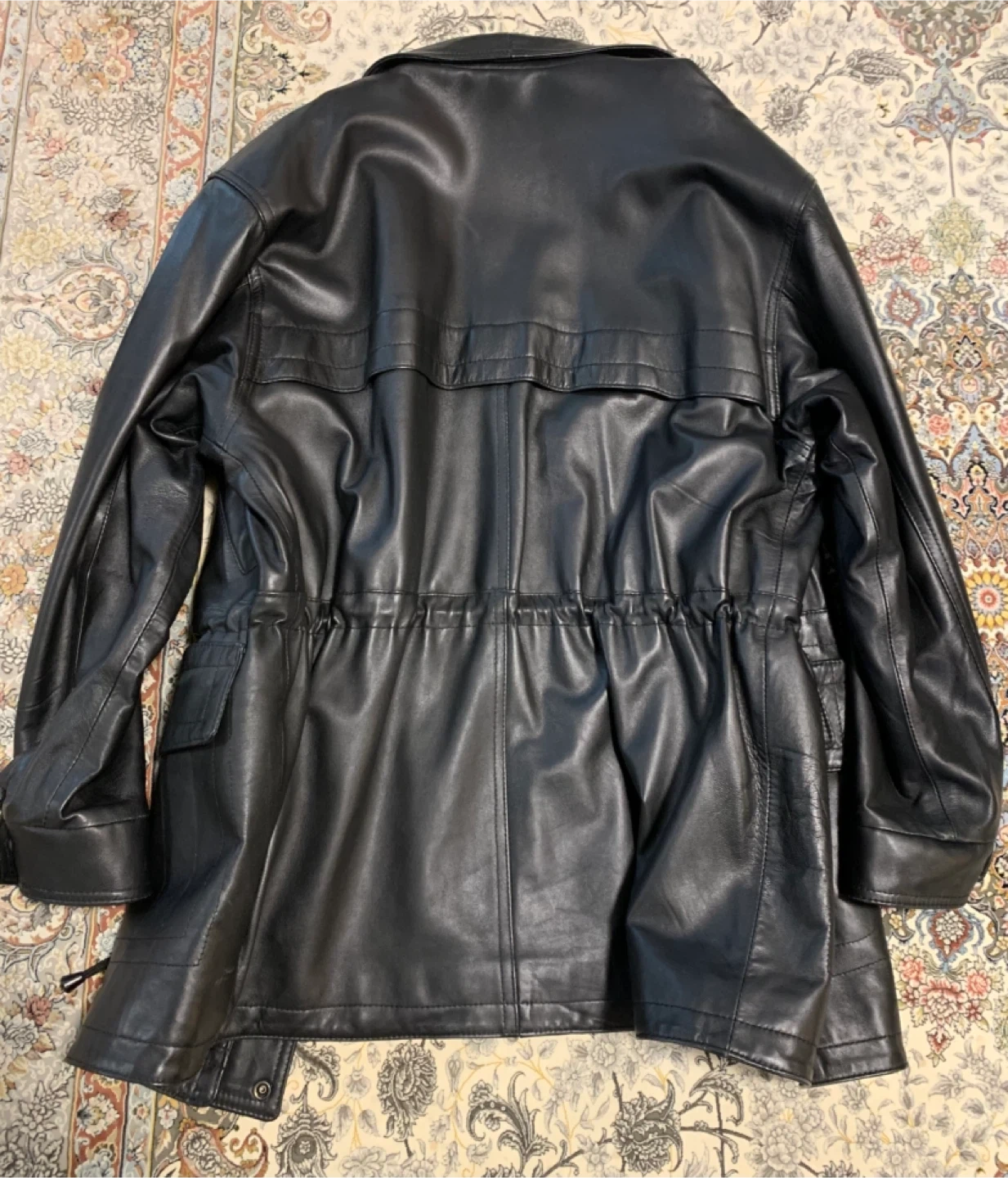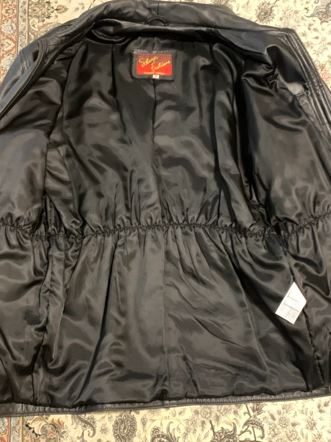 Sharp Fashion black leather jacket. It's got a full zip front and two chest pockets. Lined interior with an elasticated waist.