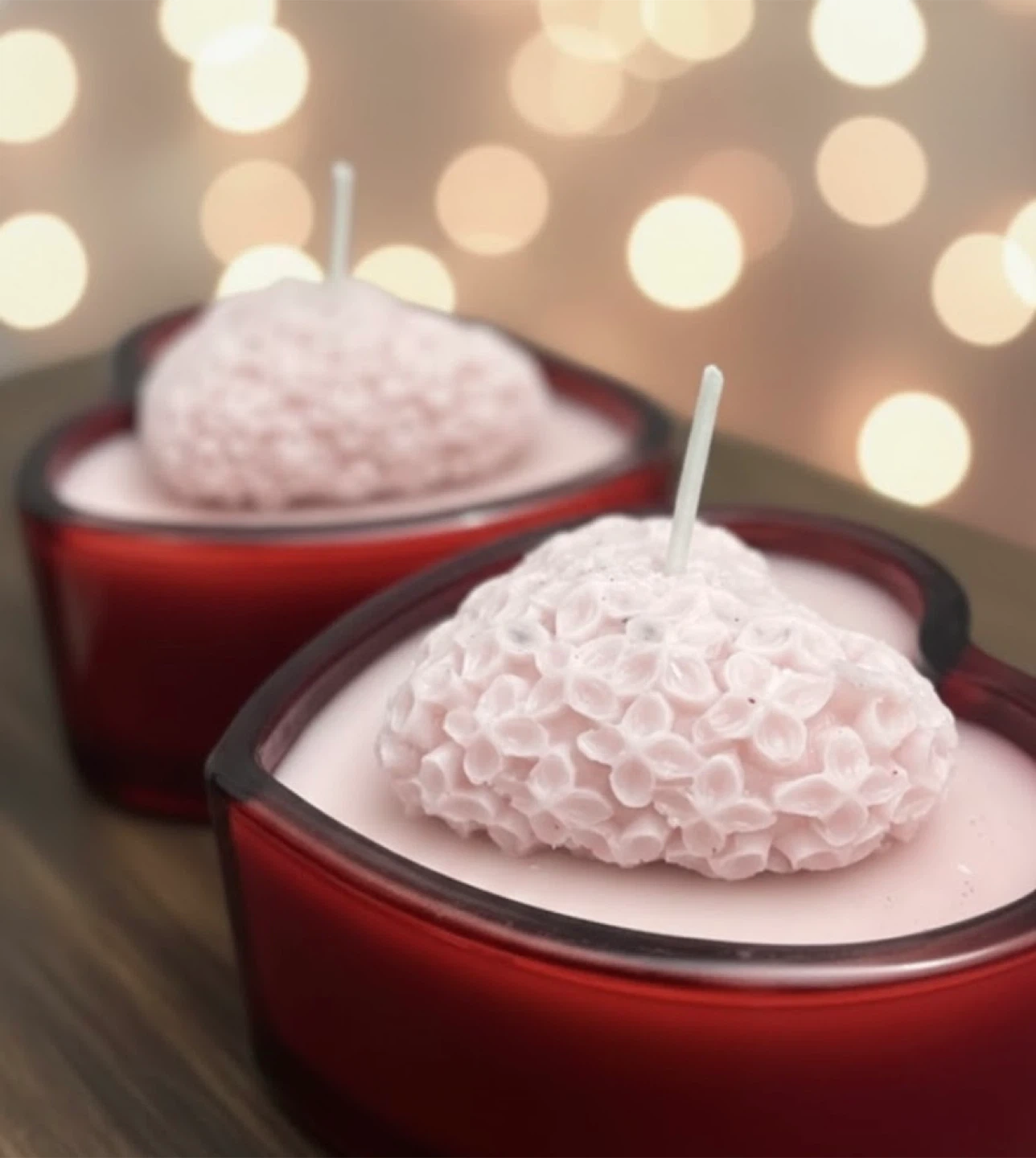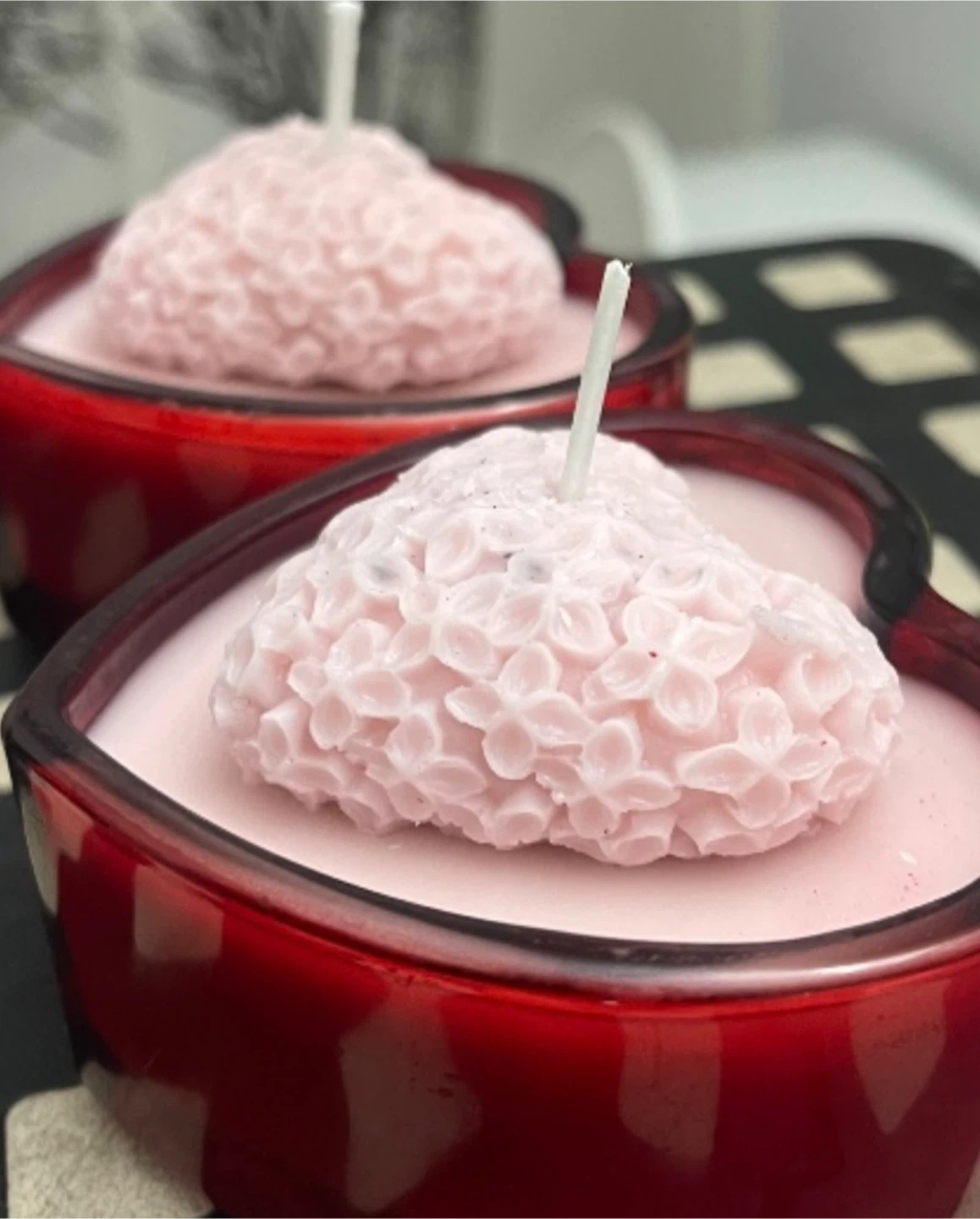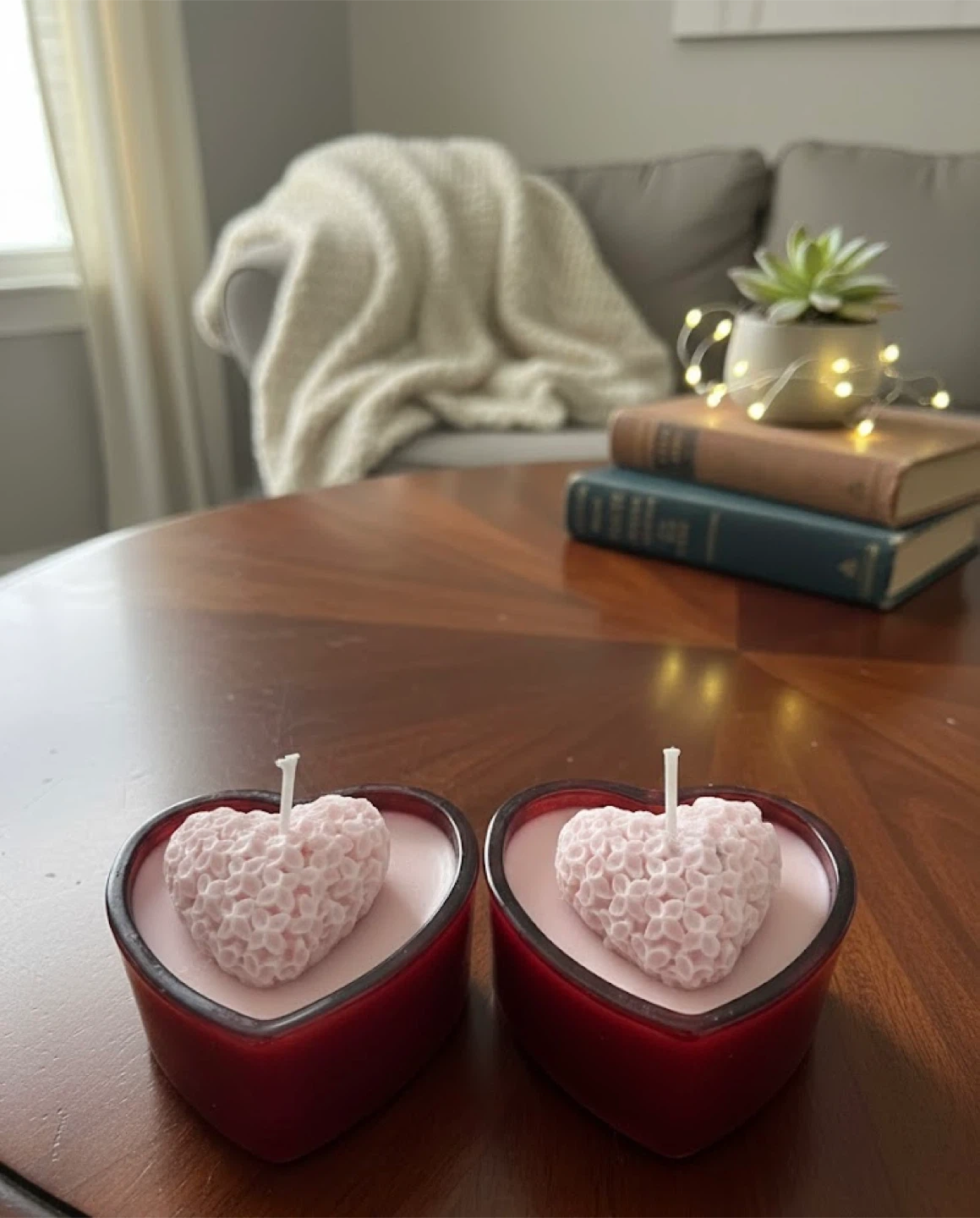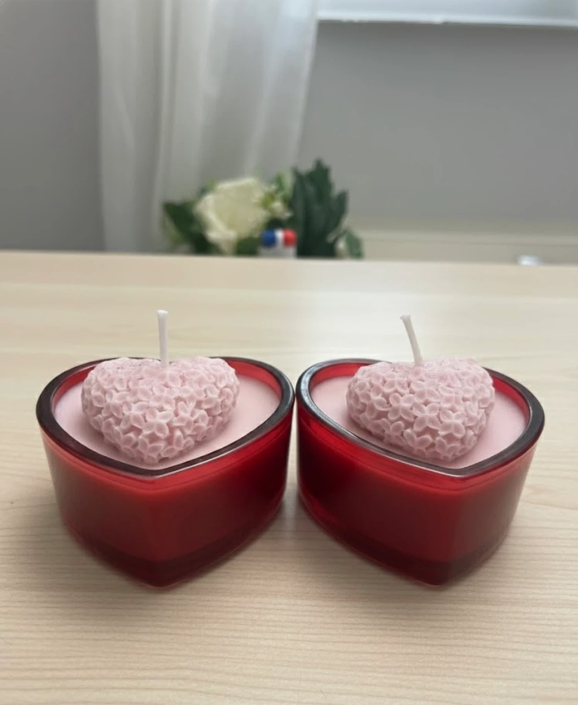 Two decorative candles shaped like hearts, presented in red glass holders. They're perfect for adding a romantic touch to any space! The wax features a textured, petal-like design.
