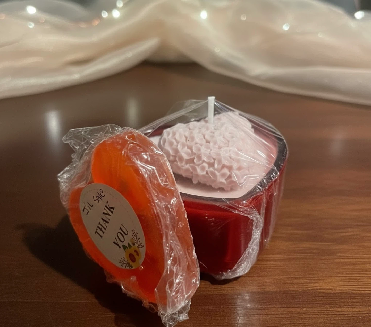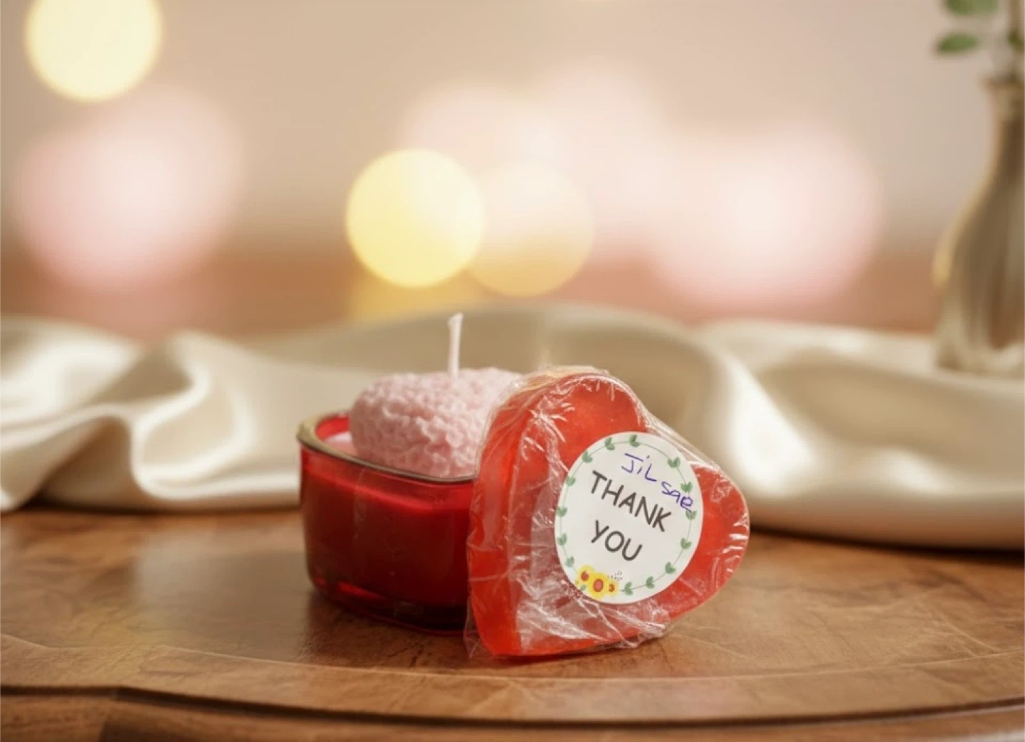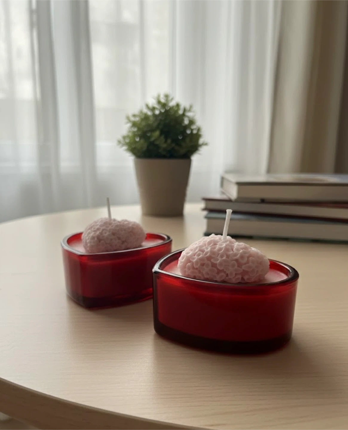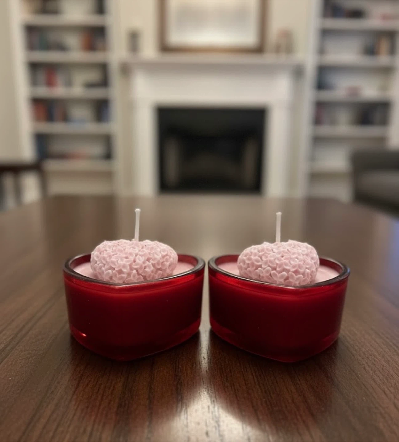 Two decorative candles shaped like hearts, presented in red glass holders. They're perfect for adding a romantic touch to any space! The wax features a textured, petal-like design.