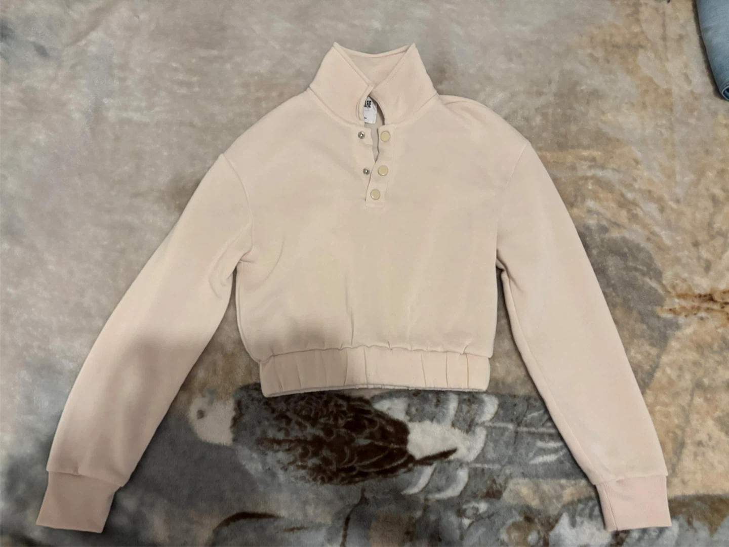 This is a Miss Selfie beige cropped pullover sweater. It's a size small and made in China. It features a high collar with button closures. 5$ each