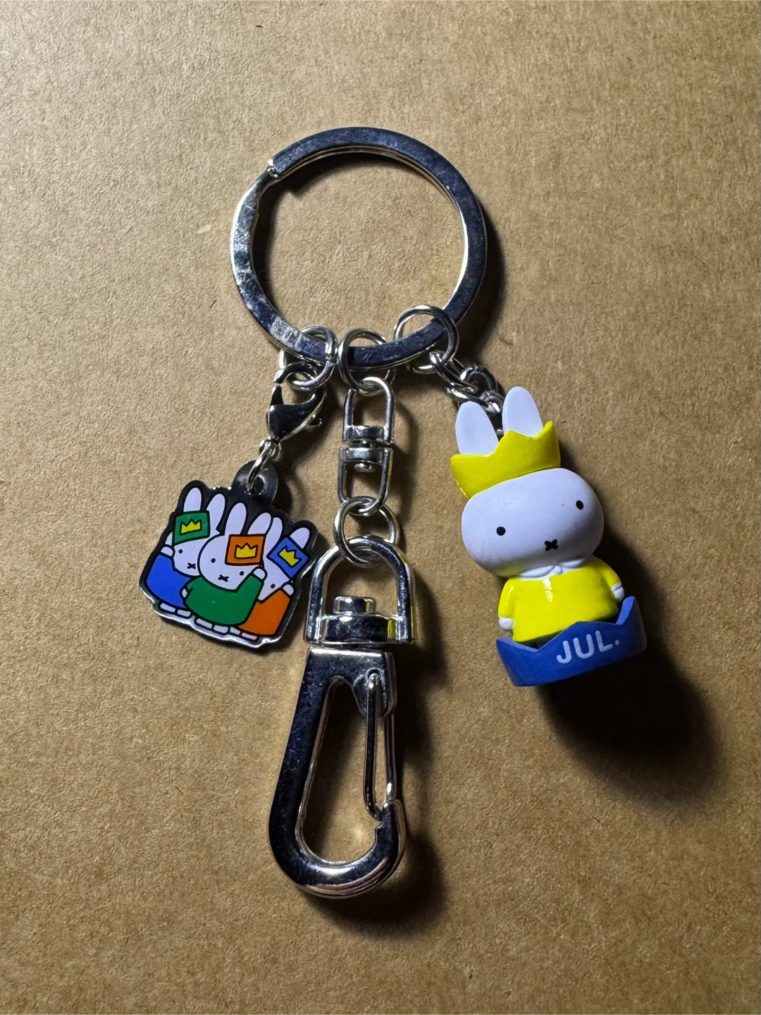 This Miffy keychain features a yellow Miffy figure with a crown, along with two decorative charms. One charm is a square with '20' printed on it. It's attached to a silver keyring with a carabiner clasp. A fun accessory for your keys or bag!