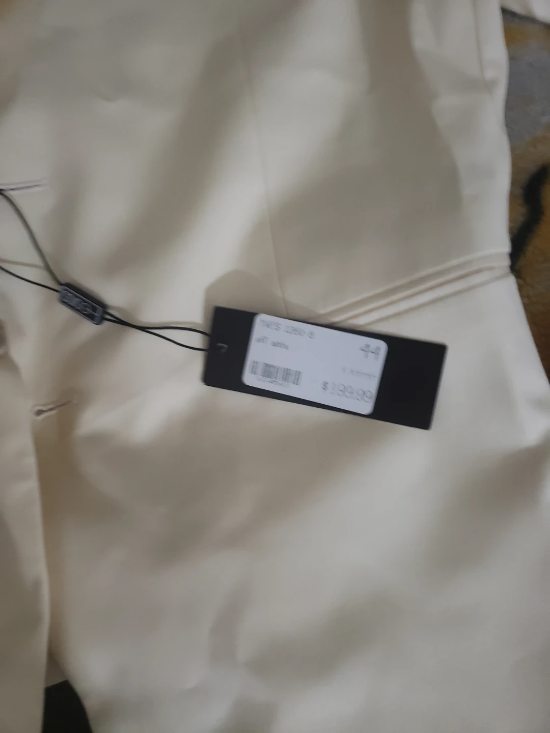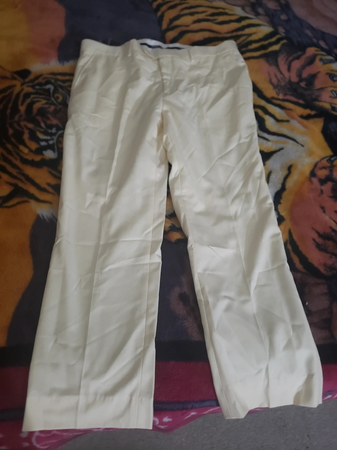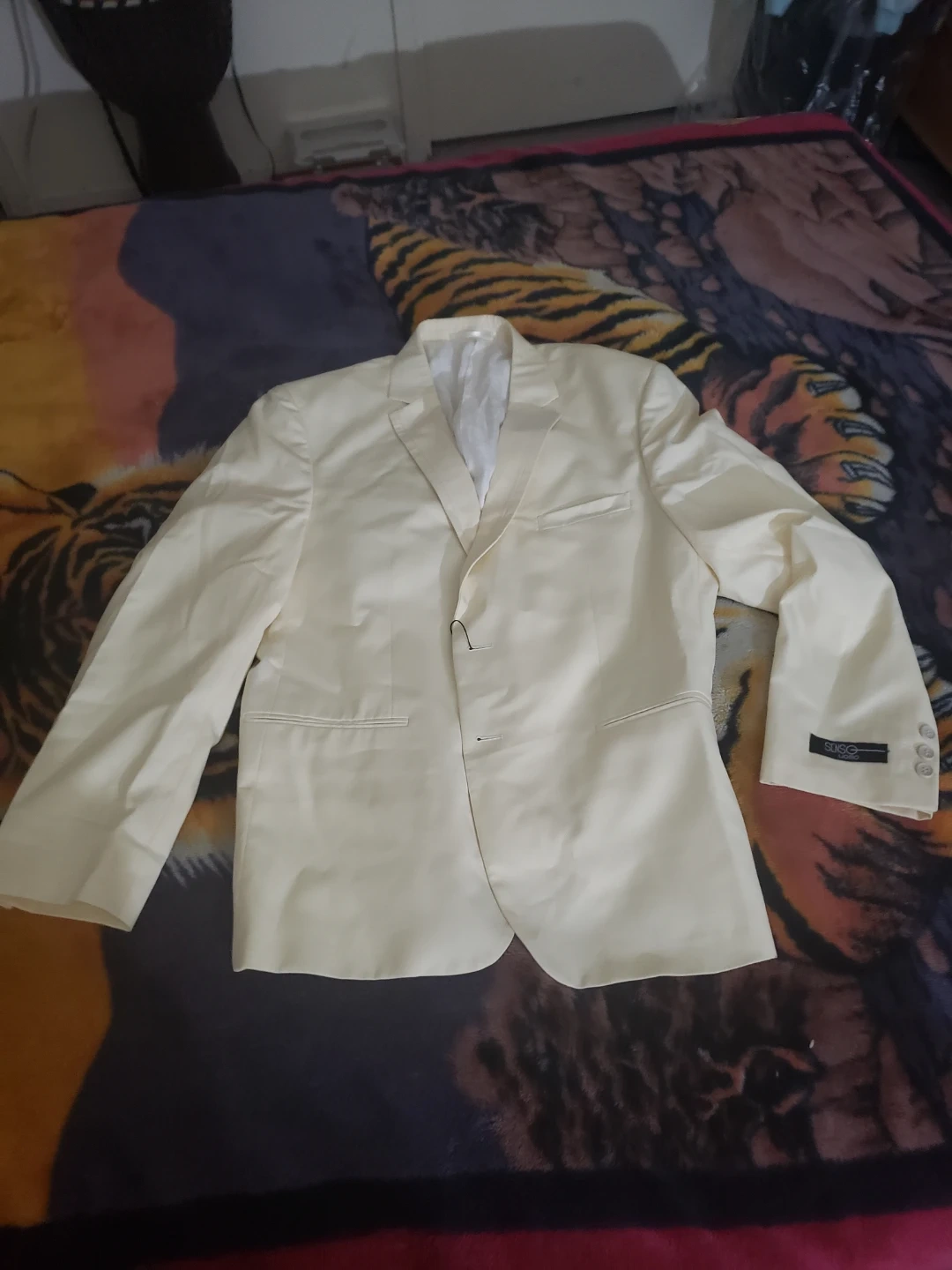 This is a cream-coloured men's suit set from SENSE UOMO. It includes a jacket and pants. The jacket features a two-button closure and the pants have a classic fit. This suit would be great for formal occasions.