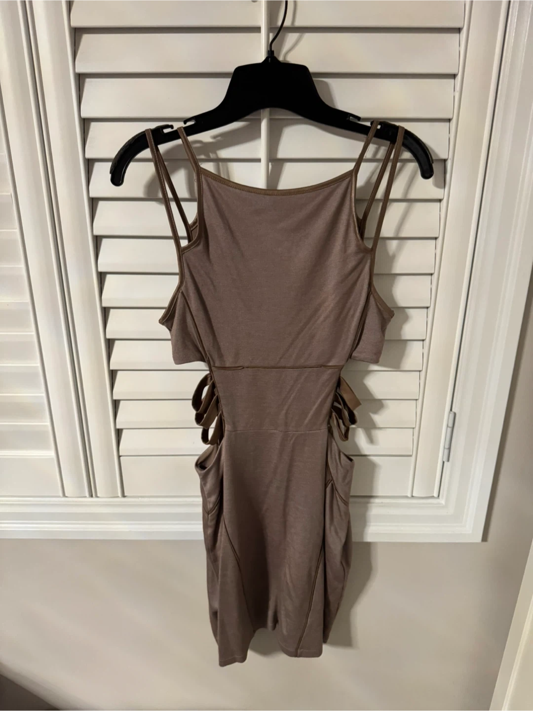 Selling a cute brown mini dress! It has a unique design with cutout details on the sides. It's in great condition and perfect for a night out or a special occasion