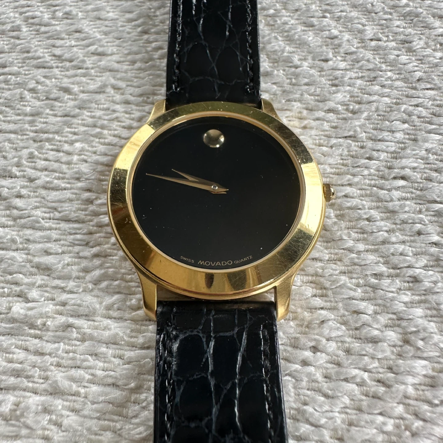 For sale is a classic Movado Museum watch from December 1997. This timeless piece features a yellow gold-plated stainless steel case (approximately 36-38mm diameter), iconic black Museum dial with the signature gold dot at 12 o’clock, slim gold hands, and no numerals for that minimalist look. It has a black leather strap with an alligator pattern and gold buckle.