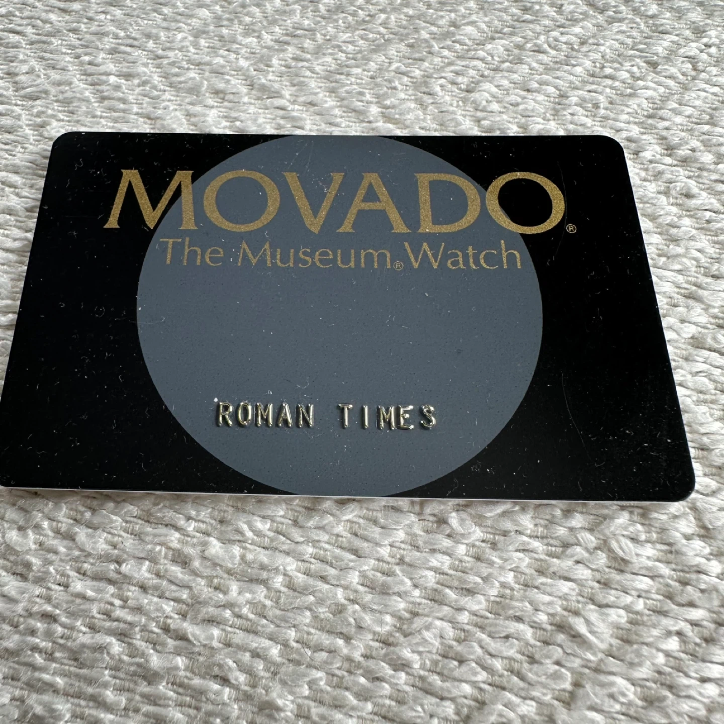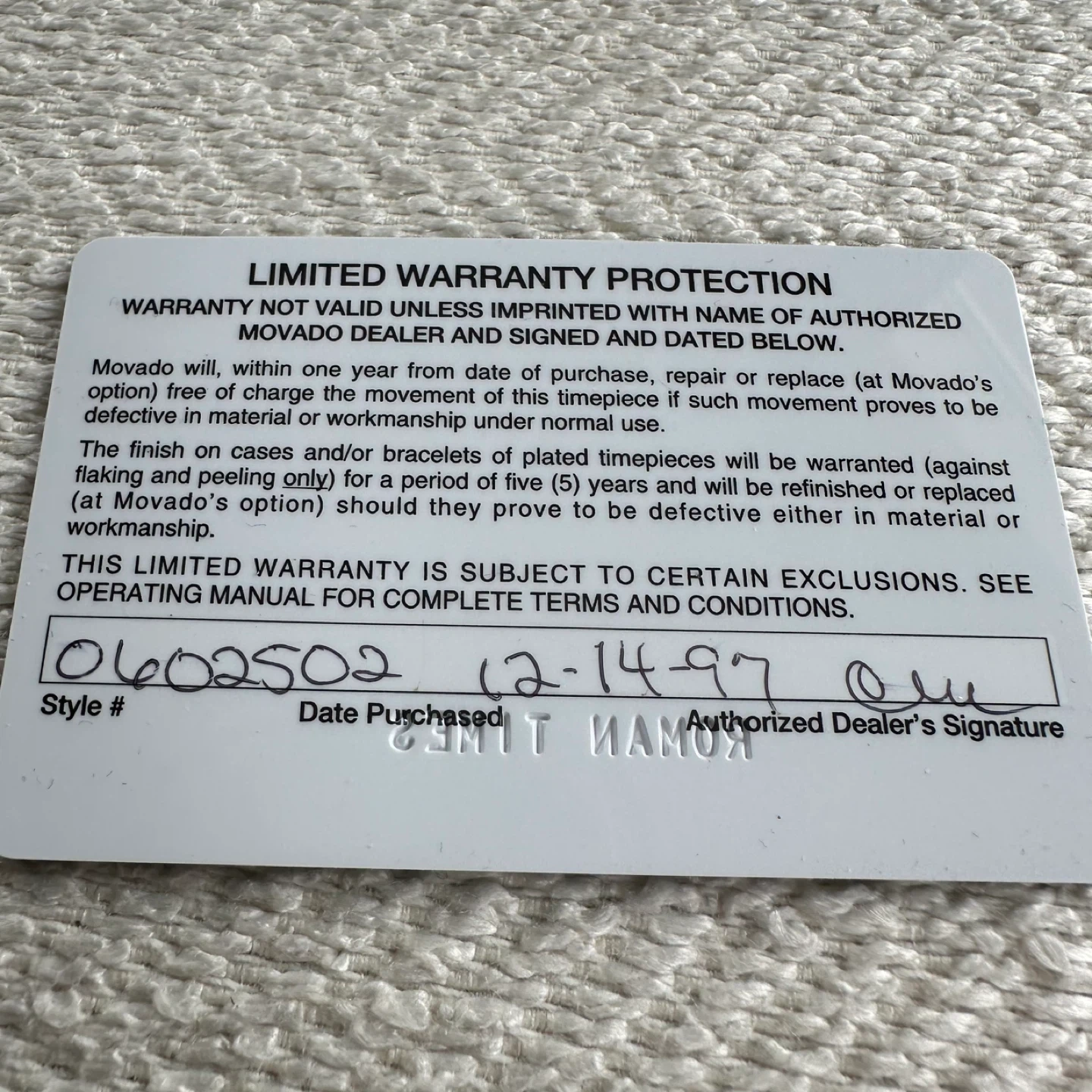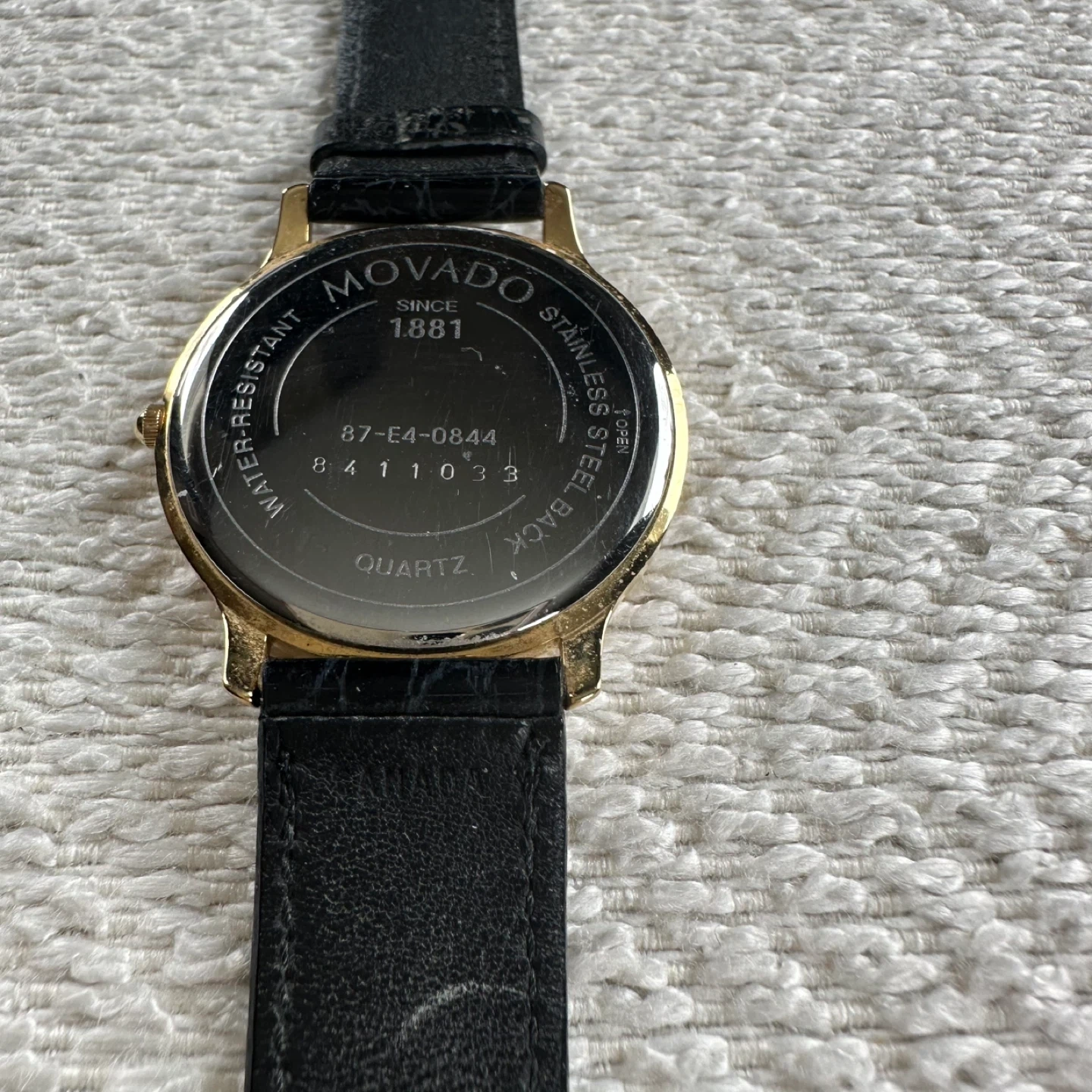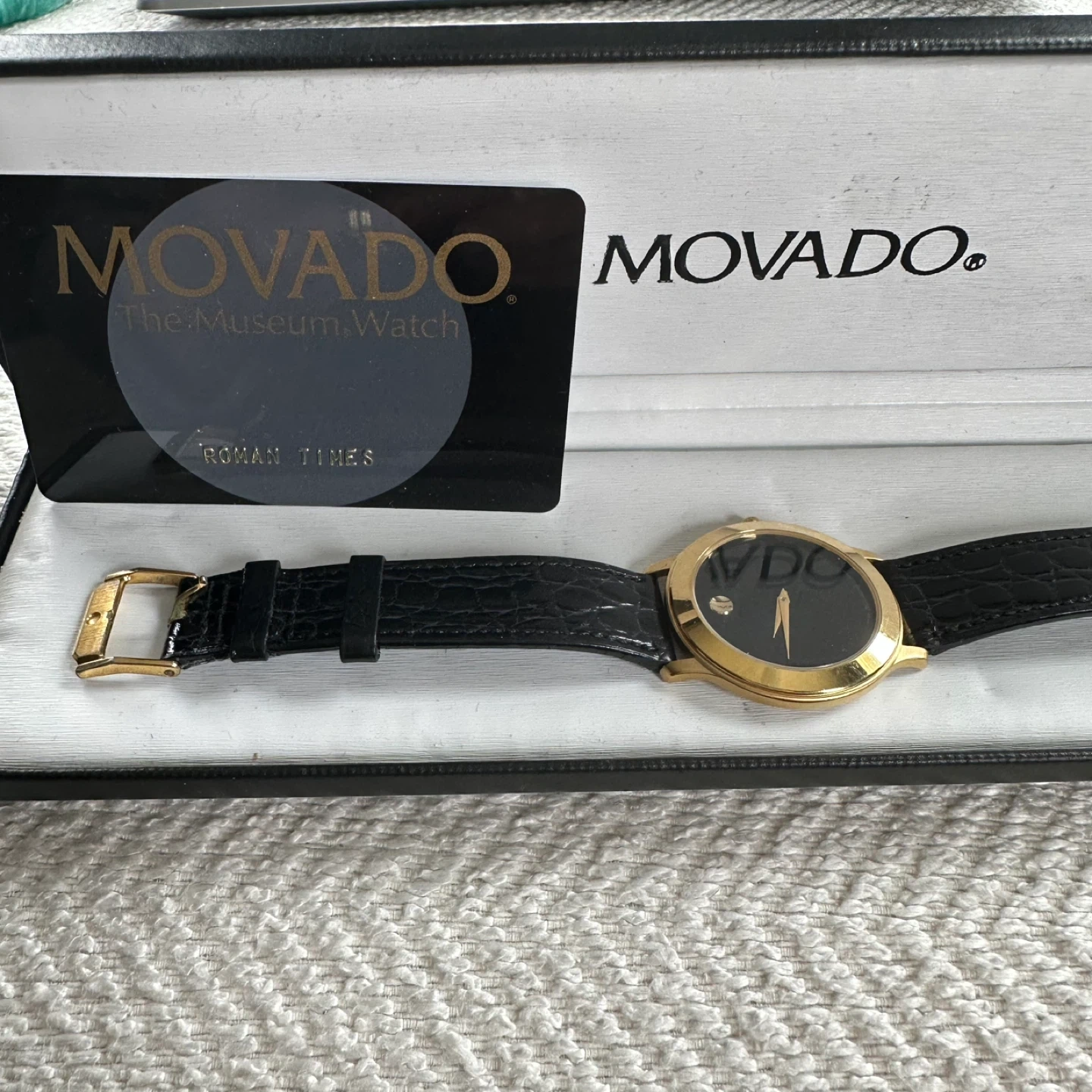 Quartz movement, Swiss made. Style number: 0605050. Comes with the original Movado box and warranty card for authenticity. The watch is in good overall condition—case and crystal are clean with minimal scratches, the strap shows some normal wear.