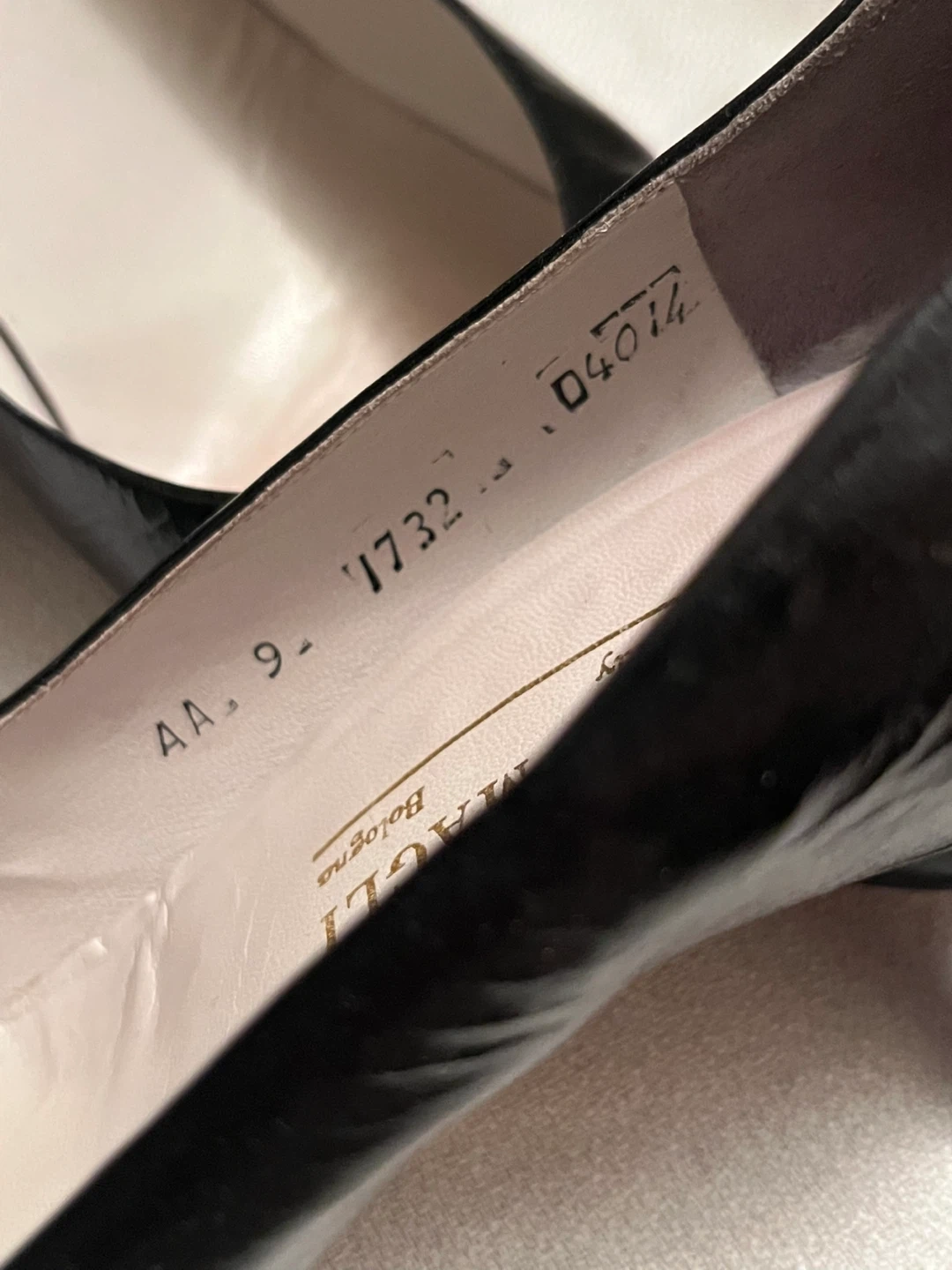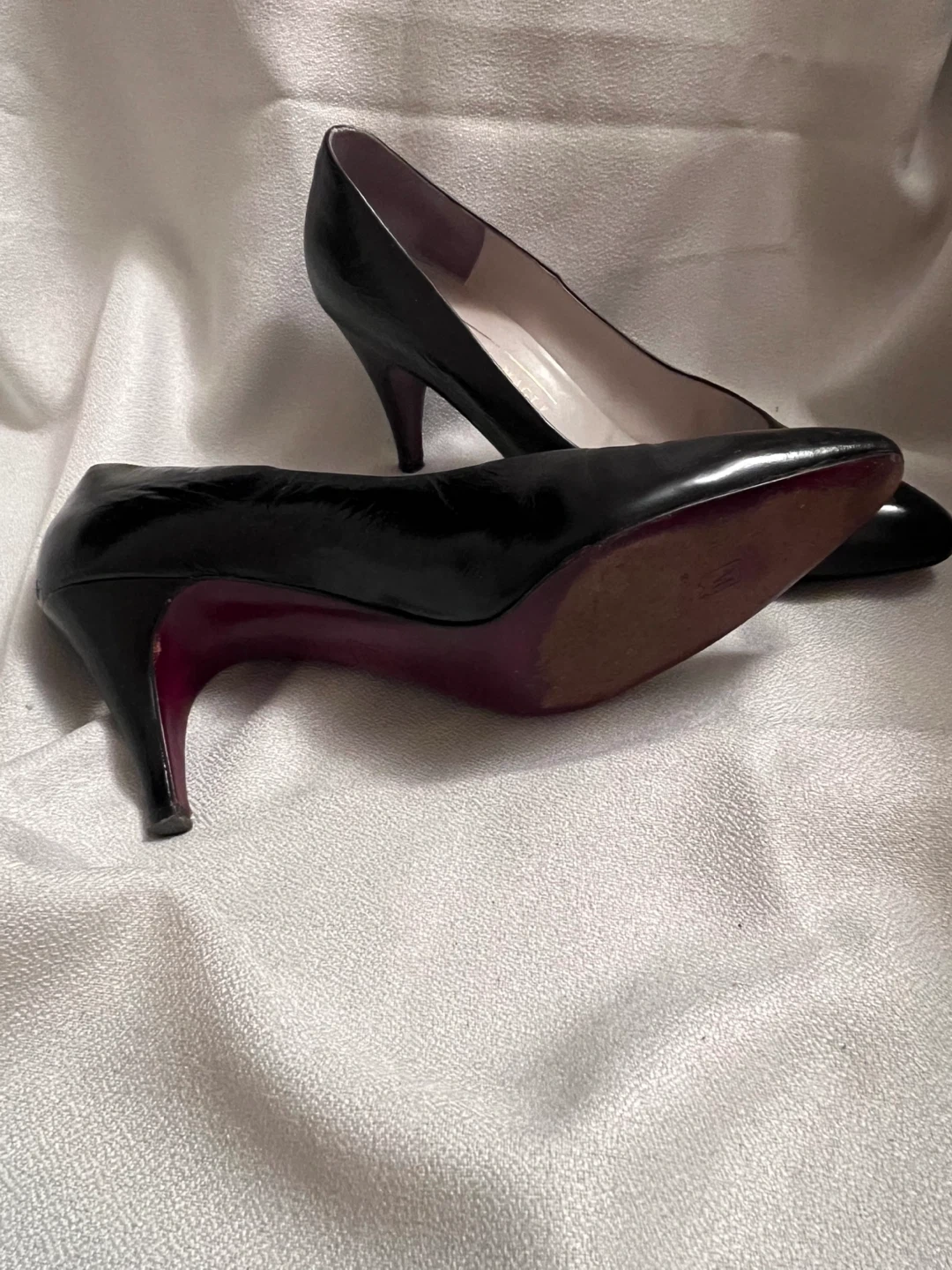 Authentic Classic black sheen leather pumps from Bruno Magli. Features a pointed toe and a comfortable heel.