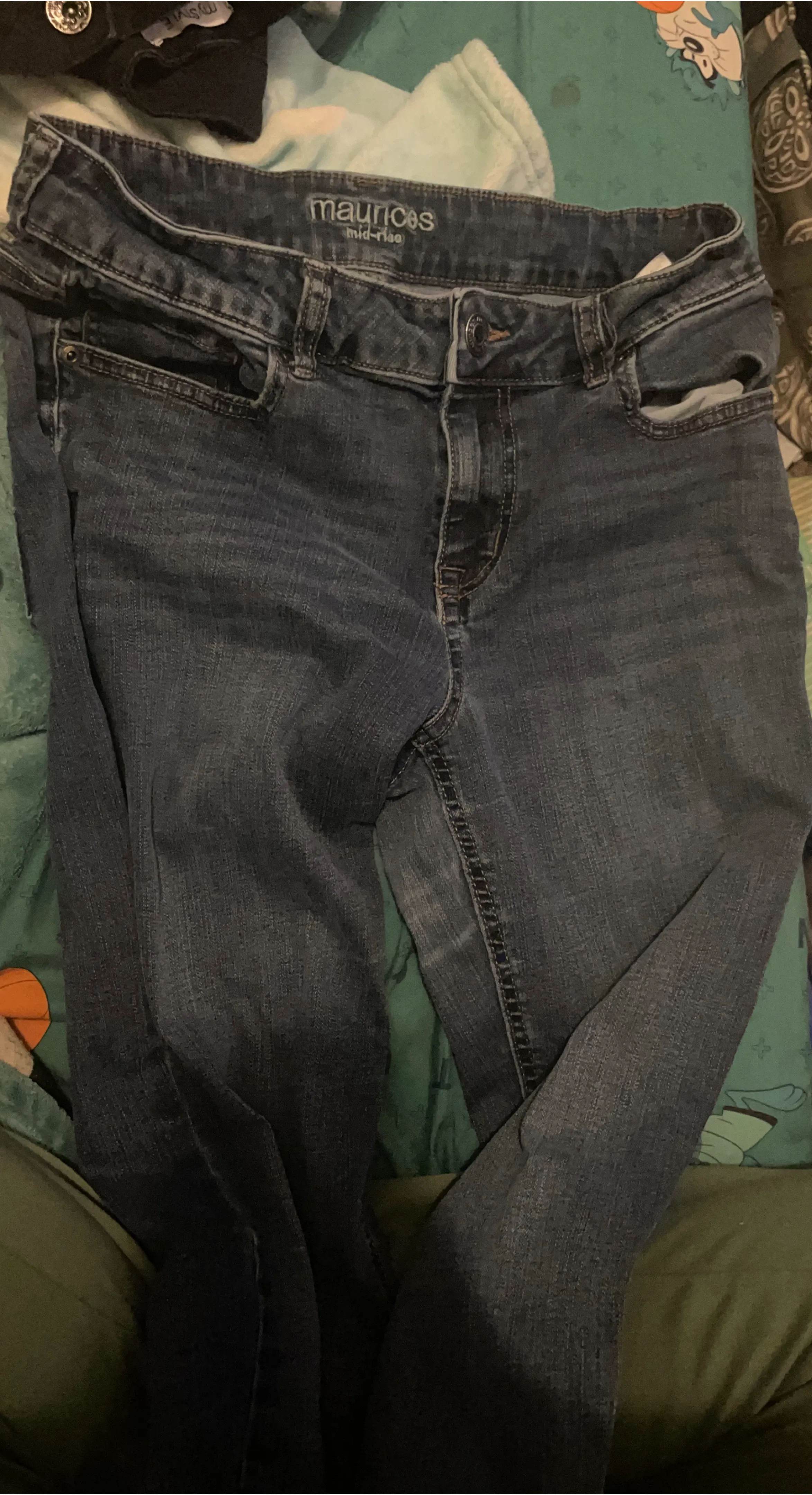 These are Maurices mid-rise blue denim jeans. They're made of a durable denim material. Classic 5-pocket styling with a button and zip closure. Good for everyday wear!