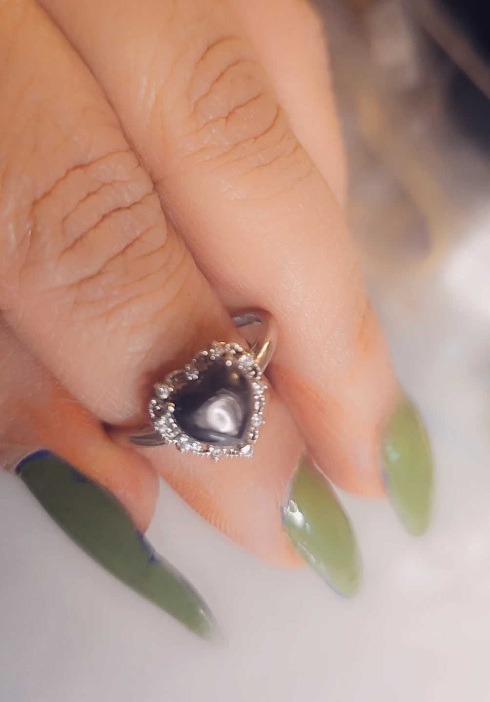 This silver-toned ring features a dark heart-shaped black obsidien stone surrounded by smaller clear accent stones. It's a lovely piece for everyday wear or special occasions. or a valentines gift