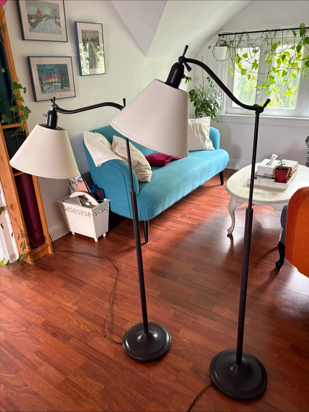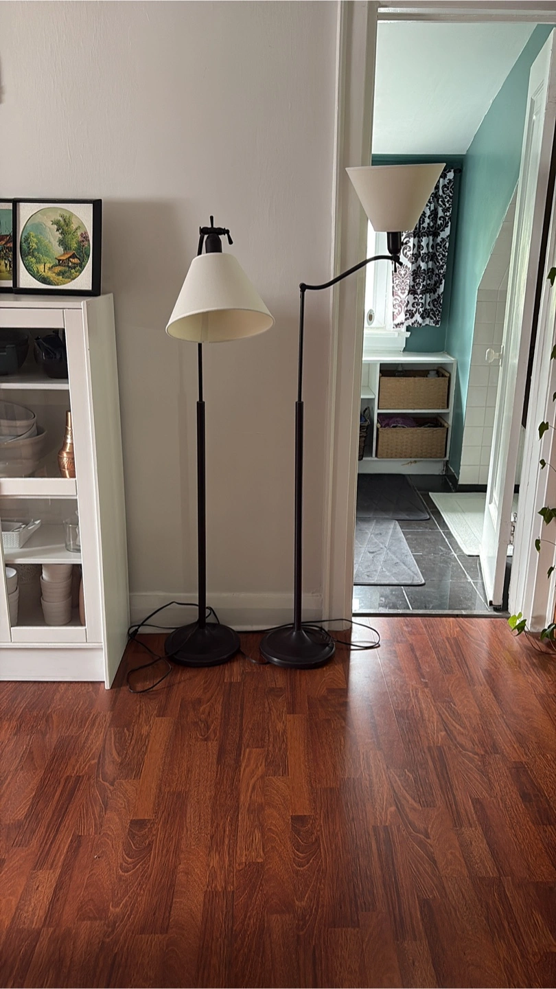 Pair of classic floor lamps. Features a very dark brown metal pole and heavy base, and the cone is a slightly creamy white. The height is adjustable and they can be used in multiple different positions. Perfect for a reading chair or a desk. One of them needs a new lightbulb.