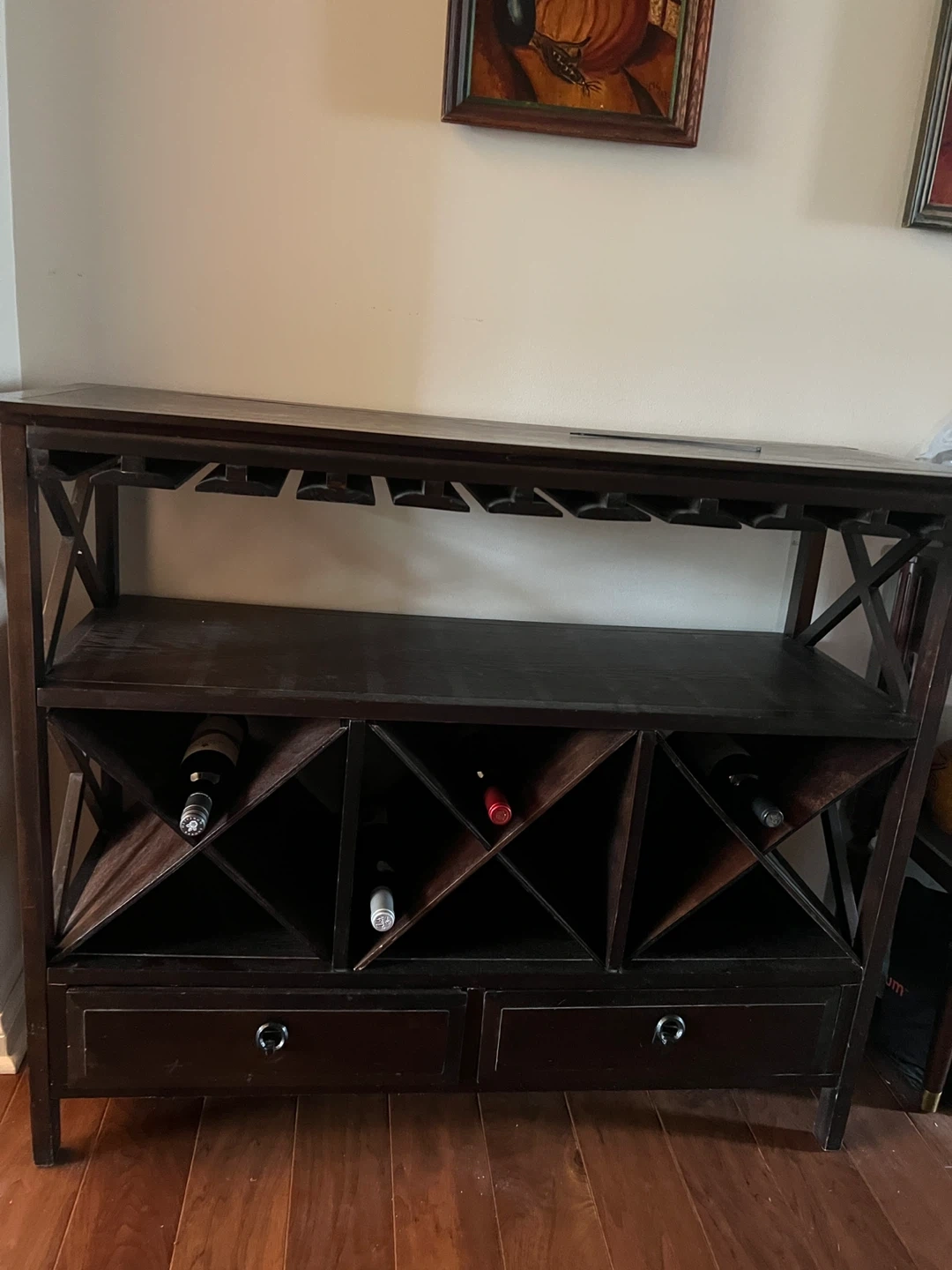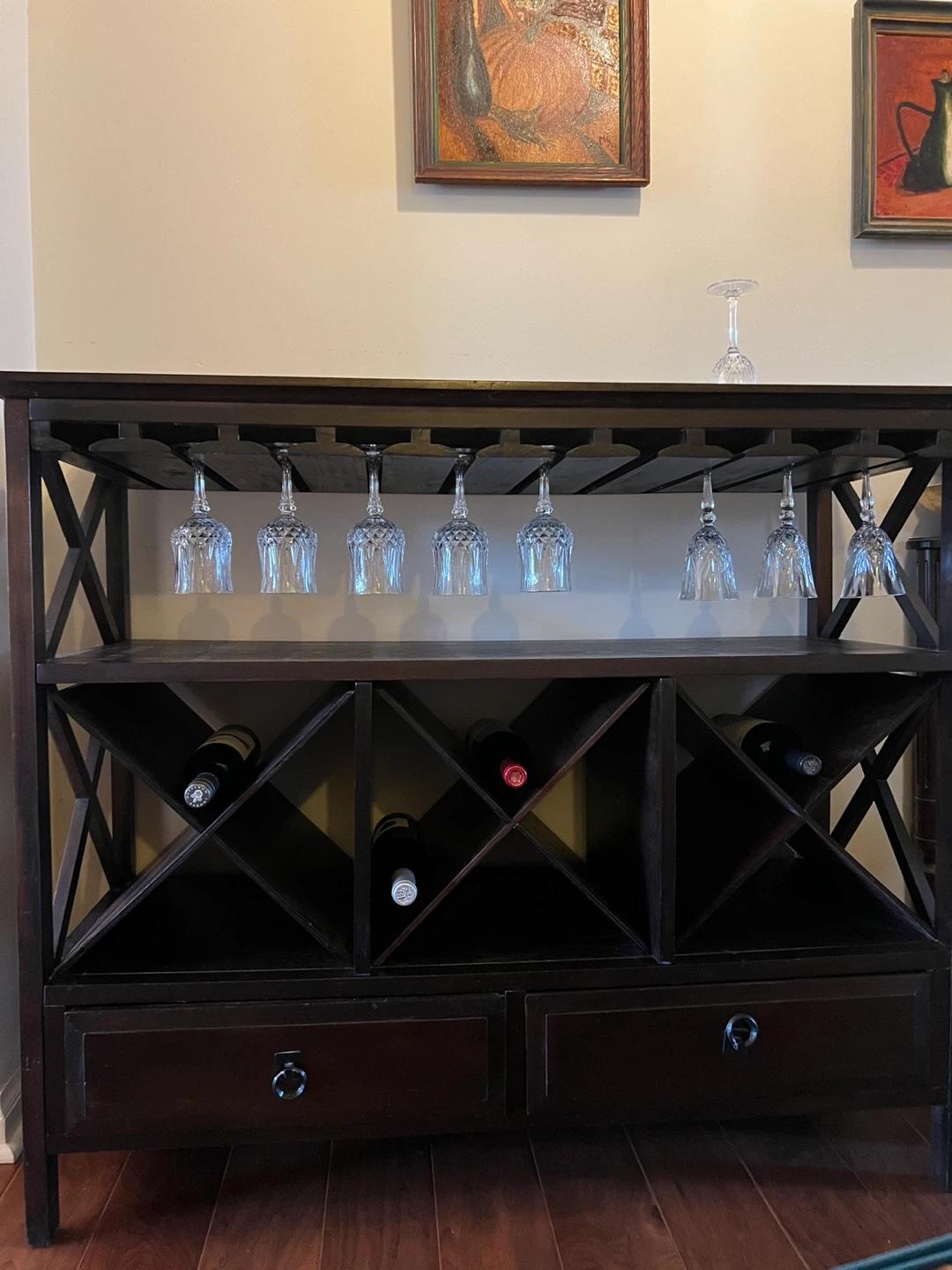 Here's a lovely dark brown wine rack cabinet! It features a rack for wine glasses and storage for wine bottles. It also has two drawers for extra storage. This piece would be a great addition to any dining room or living room!