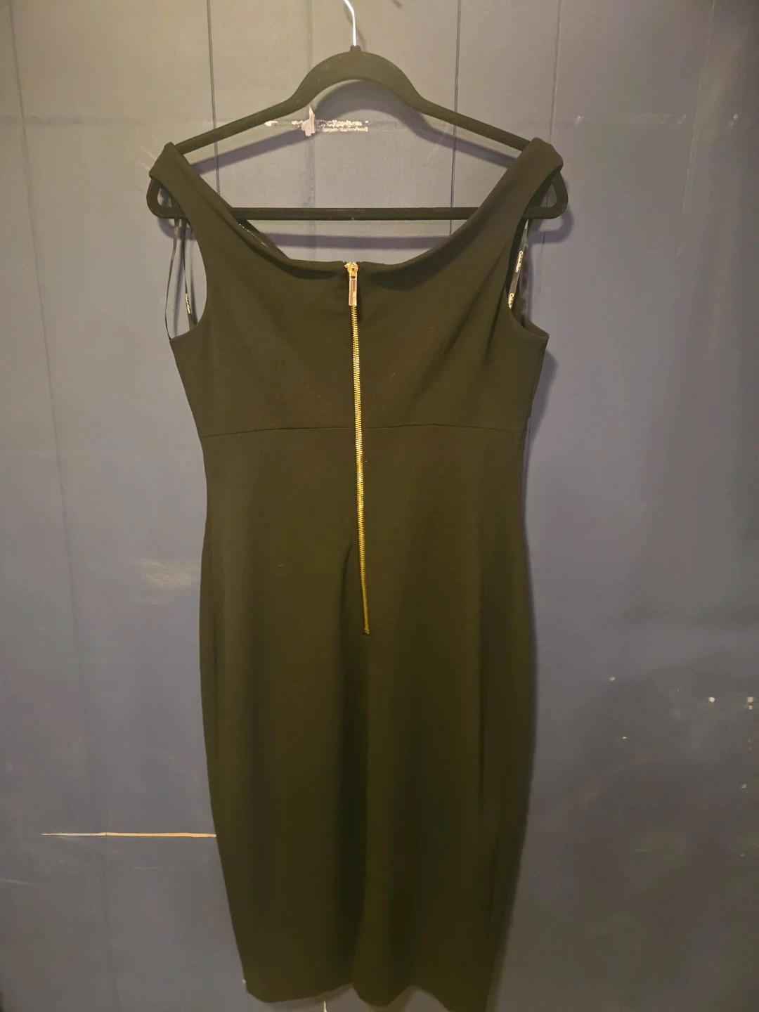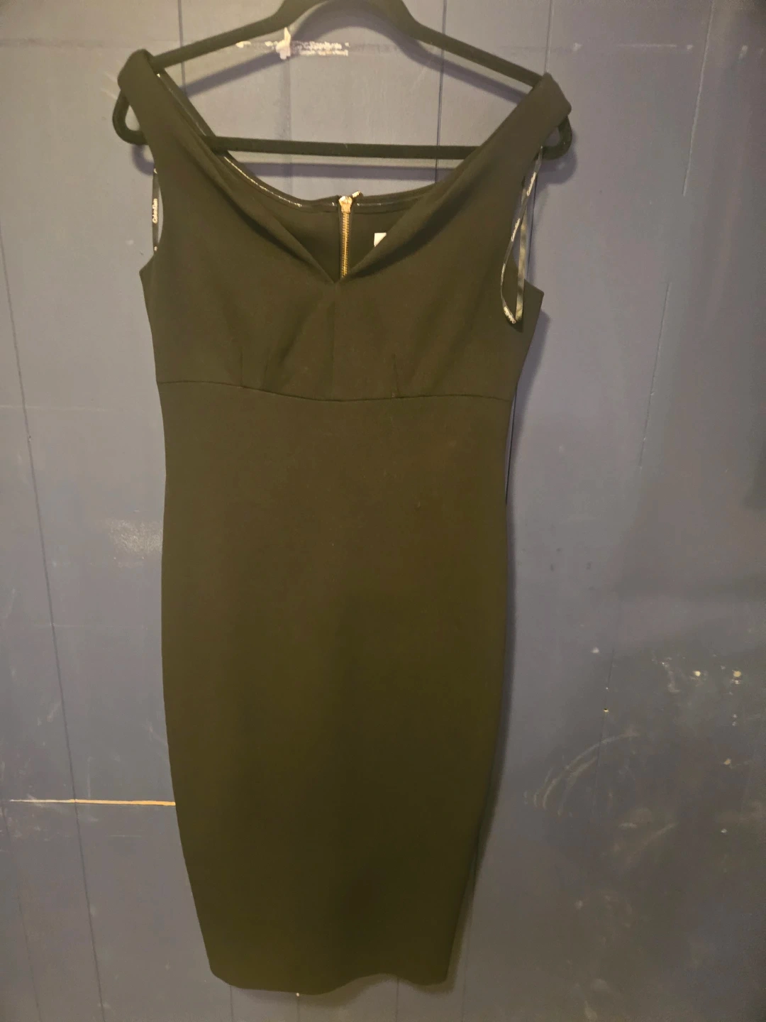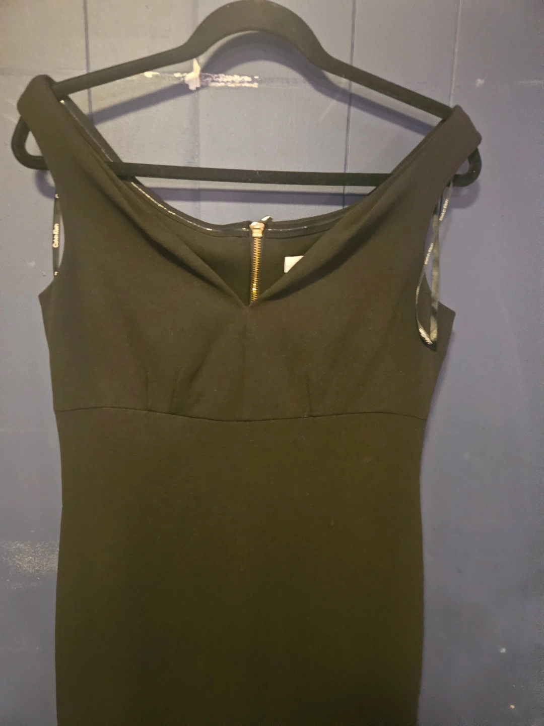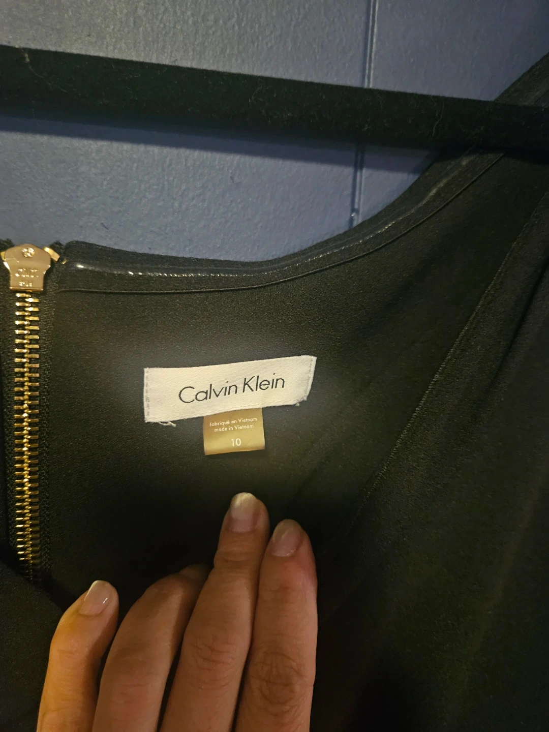 Classic black Calvin Klein sheath dress with an elegant off-the-shoulder neckline. Features a gold-tone back zipper closure. Perfect for a night out or a special occasion!