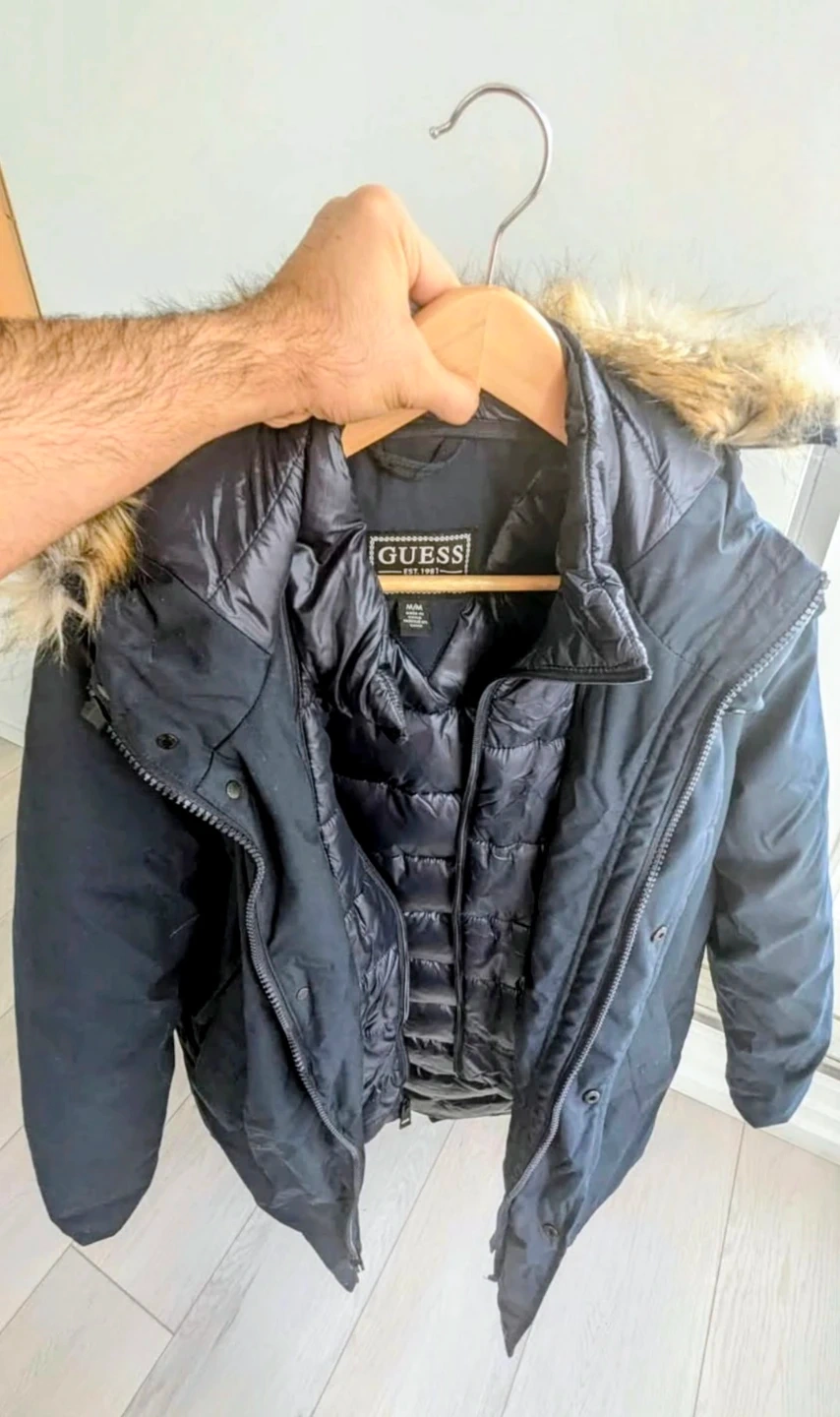 I'm selling a GUESS parka winter jacket in size M. It is dark blue and padded, perfect for the cold weather!