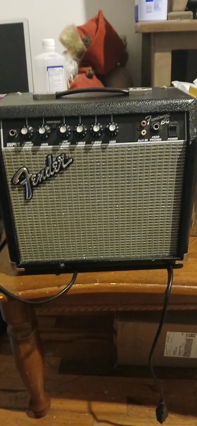 This is a Fender Frontman 15G guitar amplifier. It's black with a silver speaker grille. The amp has input, volume, drive select, gain, treble, middle, bass, and power controls. It also features an aux in and a headphone jack. Its in great condition and works really well like brand new lowest i can take is for for 50 ill come to you