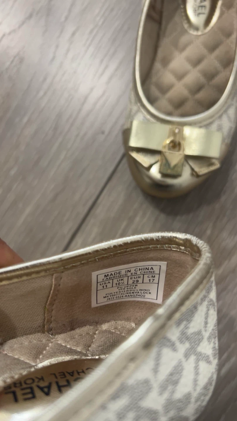 Michael Kors ballet flats for girls. Tan and white MK print. Gold buckle detail on the toe. Quilted insole. Size USA11 ,10.5 US, 29 EUR, 17 CM.