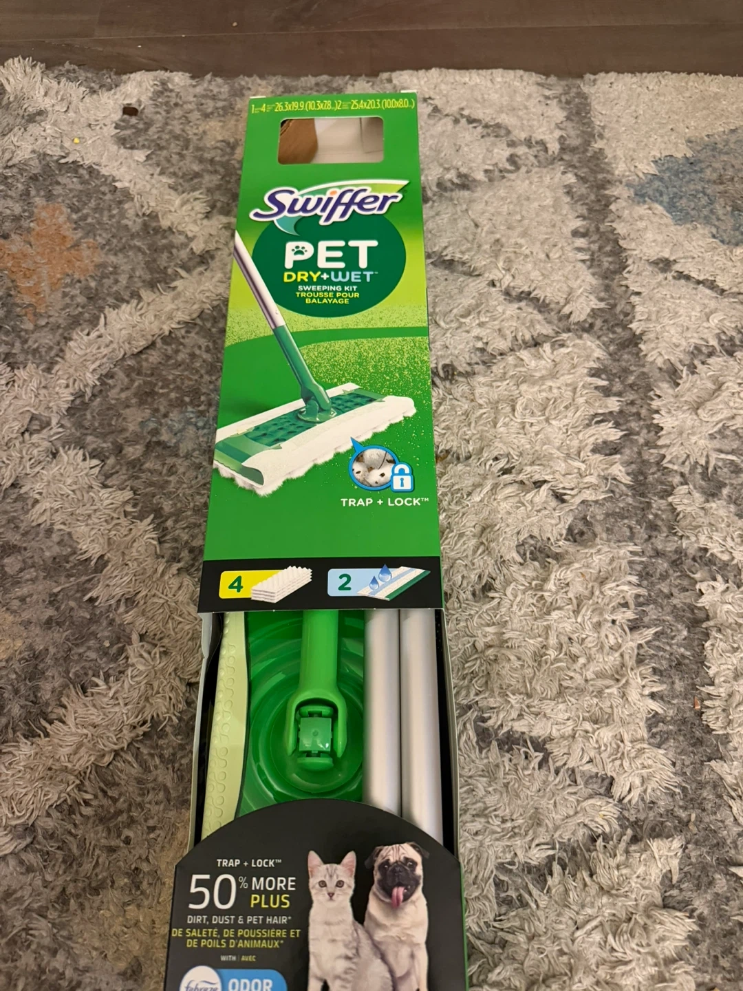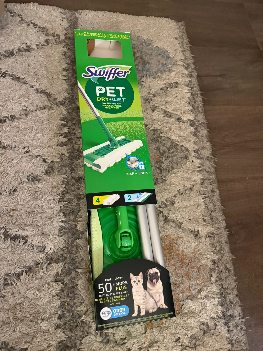 This Swiffer Pet Dry + Wet mop is designed to tackle dirt, dust, and pet hair. It's great for dry dusting and wet mopping surfaces. The kit includes everything you need to get started, making cleaning up after your pets a breeze!