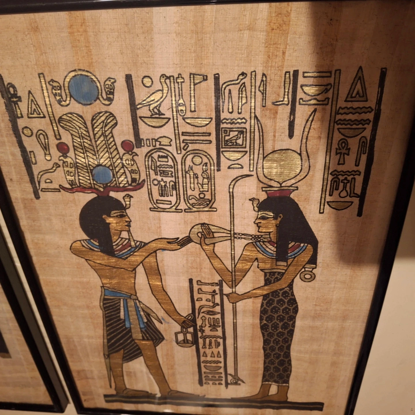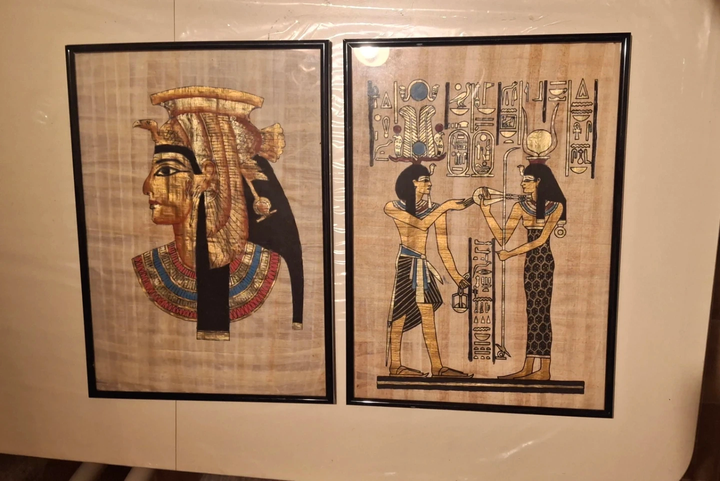 Two framed papyrus art pieces featuring Egyptian imagery. One depicts a profile of a pharaoh, while the other shows two figures and hieroglyphs. They're framed and ready for display.